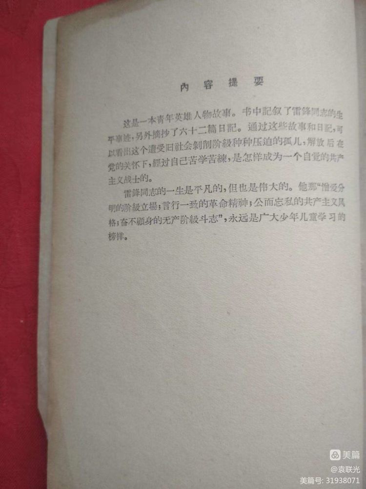 这是一本给广大少年儿童阅读的讲雷锋故事的书。书中记叙了雷锋同志的生平事迹,另外摘抄了 62 篇日记。通过这些故事和日记,可以看出这个遭受旧社会剥削阶级种种压迫的孤儿,解放后在党的关怀下,经过自己的苦学苦练,是怎样成为一个自觉的共产主义战士的。