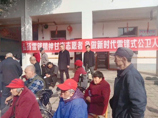 学习雷锋志愿行,乐为院民送健康。在第60个学雷锋纪念日到来之际,武穴市花桥镇卫生院副书记、院长杨云锋,院工会主席刘源,带领11名公卫人员和内三科、康复科3名医务人员,组成学雷锋志愿服务队,来到花桥中心福利院花桥分院,为49名院民、7名服务人员免费体检,用实际行动弘扬雷锋精神,为福利院院民送上医务工作者的温暖和关怀。
