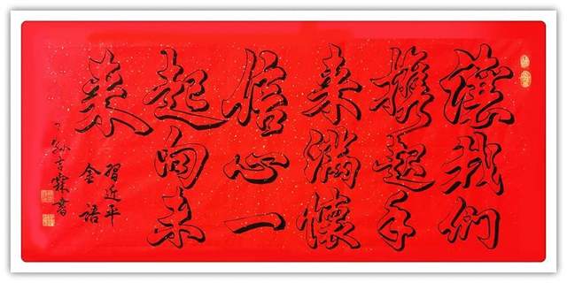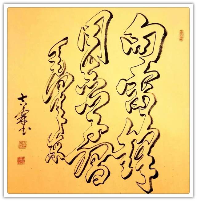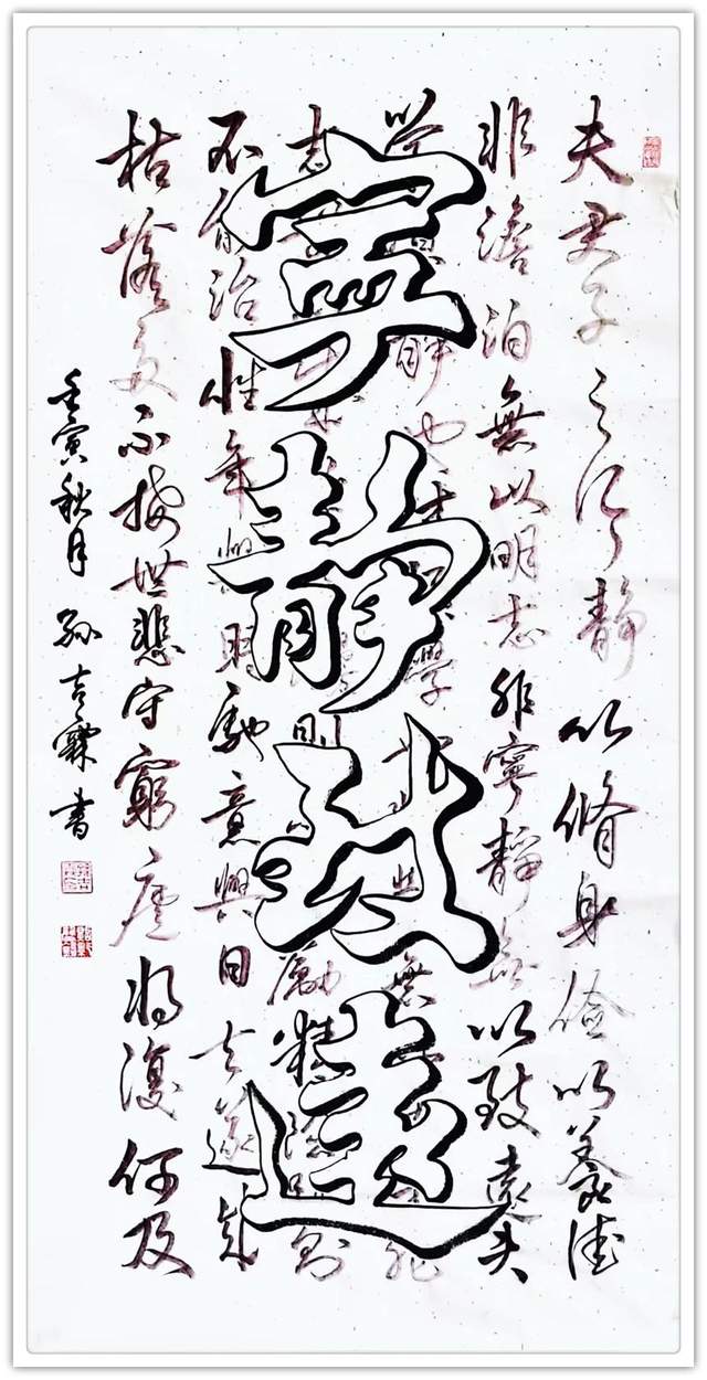 孙先生的书法,有金书锦字的审美品质,这跟取法为上的磨砺有关系,也与书性超人的表达成因果。书法如果只有取法,无有书性自如的表达,难免匠气,称为书奴。观看他的书法,毫无匠气,师二王而不拘,法米芾而不谨!绝对不作书奴,必有自立面目的勇气和成绩!在锋须往来之间,写得高低有趣。有怀素书法的妙于瘦,铁点银钩,方圆周备。也参意张旭书法的妙于肥,笔墨有气象,丰姿多神!当然,在他的书法里,还可以读到徐渭草书的笔墨磅礴,有骨有内,有劲有气,是谓圣!取历代诸贤的笔墨精神,融会贯通,经营自己的书法灵魂,不遗余力!这是先生的书法有审美品位,有专业境界的重要原因。每遇大展必有高段位奖项,亦有诸多作品成为文化机构的国藏上品,还有作品走出国门成为文化交流的信物,被印制成邮册发行,拥有国家文化名片的资质!