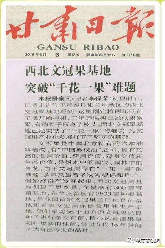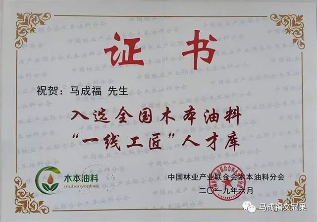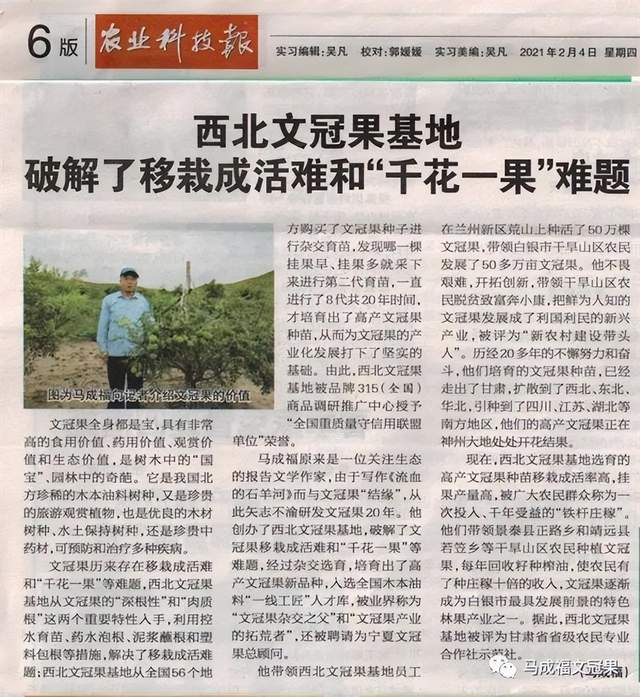 马成福原来是一位关注生态的报告文学作家,由于写作《流血的石羊河》,与抗旱节水的文冠果一见钟情,从此矢志不渝研发文冠果23年。他创办了西北文冠果基地,破解了文冠果移栽成活难和"千花一果"等难题,经过杂交选育培育出了高产文冠果新品种,入选全国木本油料"一线工匠"人才库,被业界称为"文冠果杂交之父"和"文冠果产业的拓荒者",还被聘请为宁夏文冠果总顾问。原来兰州市只有一棵300年的文冠果,他带领西北文冠果基地员工在兰州新区种活一棵树比养活一个娃娃还难的荒山上种植了50万棵文冠果;原来白银市只有一棵300年的文冠果,他带领白银市干旱山区农民发展了50多万亩文冠果。他不畏艰难,开拓创新,以实践科研和宣传推广为一体,带领干旱山区农民脱贫致富奔小康,把鲜为人知的文冠果,干成了利国利民的新兴产业,被评为"新农村建设带头人"。历经20多年的不懈努力和奋斗,我们培育的文冠果种苗,已经走出了甘肃,扩散到了西北、东北、华北,引种到了四川、江苏、湖北等南方地区,我们的高产文冠果正在神州大地处处开花结果。