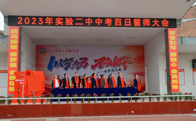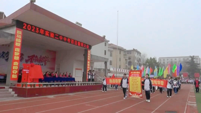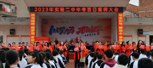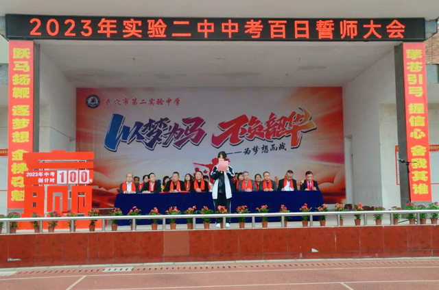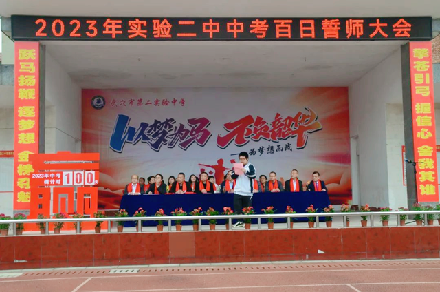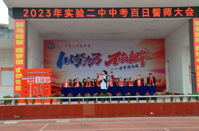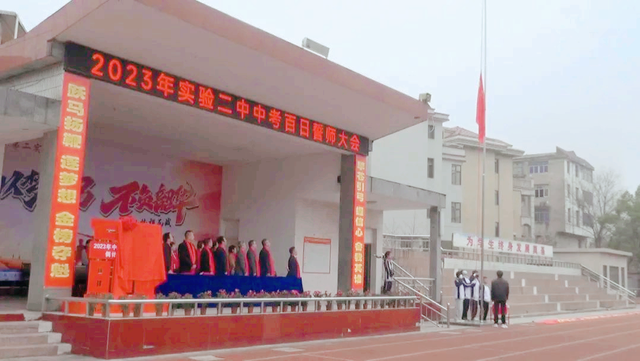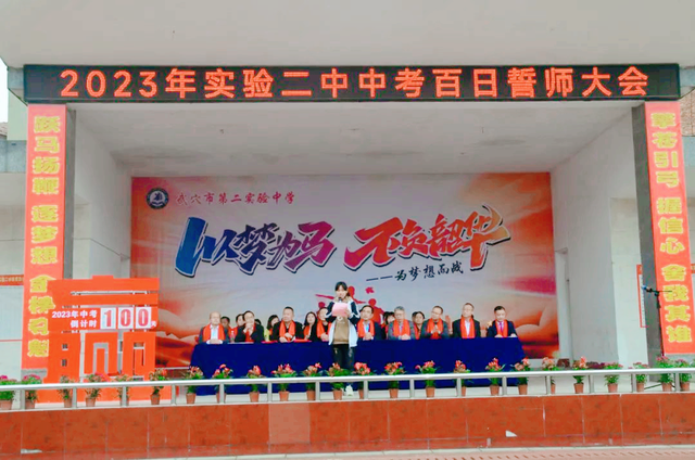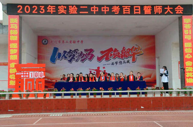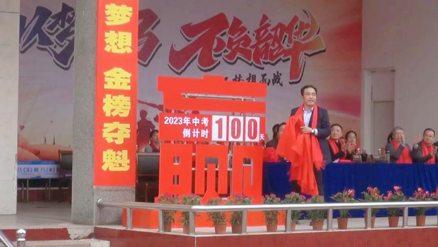 校长曾跃峰为中考倒计时100天揭牌,勉励学生发扬二中的拼搏精神,分秒必争,勇创佳绩。