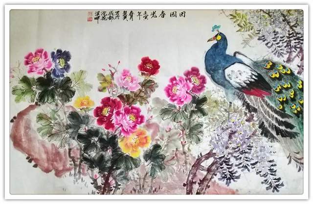 在当代画坛,中国画的画法有点儿乱糟糟的现象,一些人士画画有“乱涂乱抹”的习气,结果画出来的东西粗服乱头,不显雅观,没有赏心悦目的艺术属性。现在你去看蒋慧英女士的所有作品,都相当注意用心营造唯美的气氛,落笔定位准确,笔笔相生,笔笔到位,比如《花团锦簇满山川》这样的作品,既是执笔在手,运笔在心,心有竹成的塑造过程,所以画质天然,随心应手。