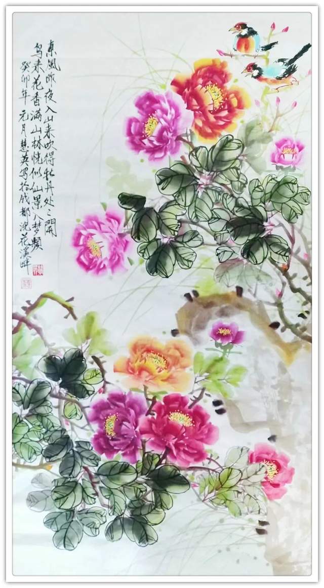 精湛的画法,除了有自我修炼的原因之外,还有法由师授的机缘。蒋慧英女士曾经师从王西林、马小松诸先生,得到口传手授,更好地觉悟了画道。又私娴齐白石画法,追求妙在似与不似之间的玄机要妙,不因似而俗,不因不俗而欺世,带着兼工能写的炉火纯青作花鸟,可再夺物象之精神,可以掠物象之体貌,所画牡丹最具独家特色!娇而不艳,枝味铺陈得相当天质自然,以求空间灵动大气,花头艳而不俗,不着丝毫烟火气,全是臻域仙子来!