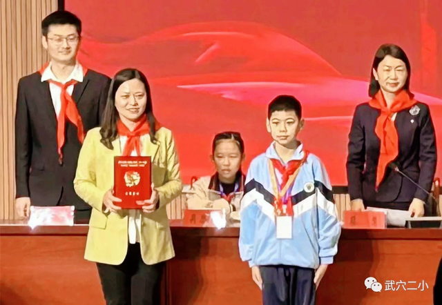大会颁发了2022年“红领巾奖章”四星章、全国优秀少先队员荣誉,该校少先队辅导员鄢丽君老师、六(8)中队队员陈铭作为受表彰的先进集体和个人代表上台领奖。