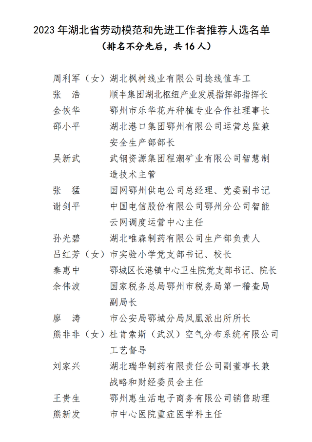根据《关于开展2023年湖北省劳动模范和先进工作者评选表彰活动的通知》(鄂人社奖[2023]8号)文件精神,经各地各部门推荐申报、市劳模评选表彰工作领导小组办公室初审、市总工会党组审议、市劳模评选表彰工作领导小组集体研究审定,现将鄂州市16名湖北省劳动模范和先进工作者拟推荐候选人名单予以公示。