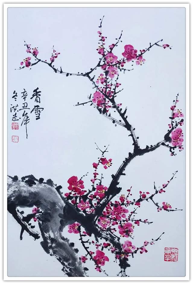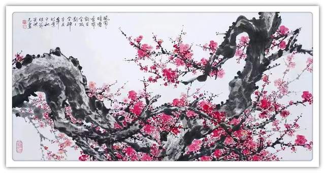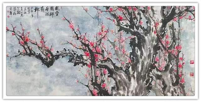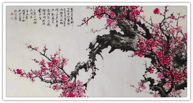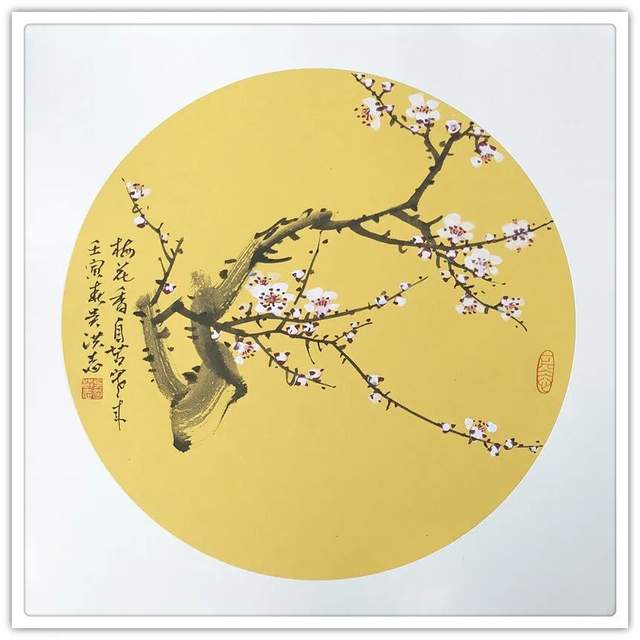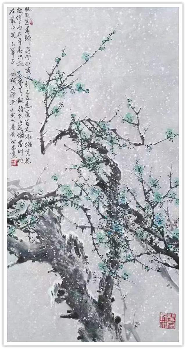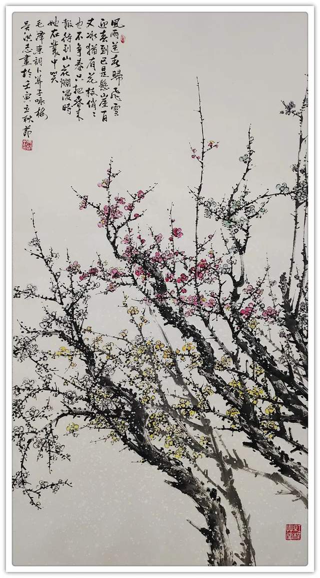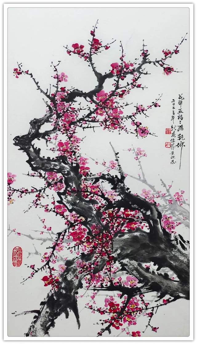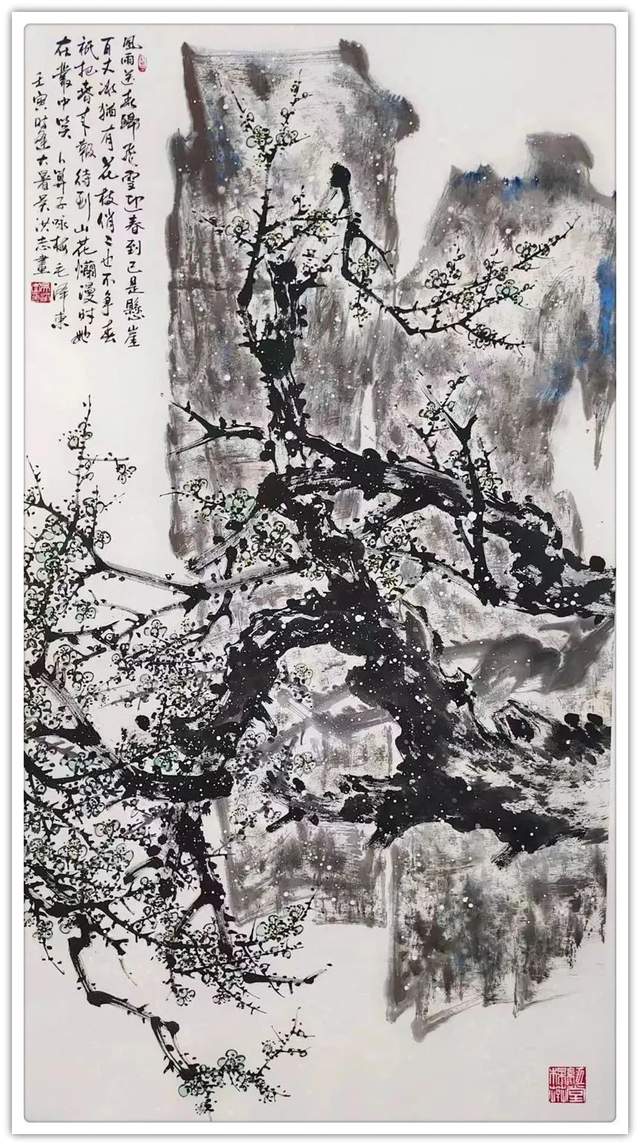 吴洪志喜欢画梅花是因为他从小长在山村梅花坞中,是这座梅花山的灵魂给吴洪志留下了深刻印象,吴洪志笔下的梅花应该是这样漂亮。当然,他也不是凭空幻想。山村地头老梅树的铁干虬枝,茅舍旁边梅海茫茫,香气扑鼻而来,香飘万里,使人感到心旷神怡,让人难以捕捉。这些美,构成了吴洪志画梅花的灵魂!