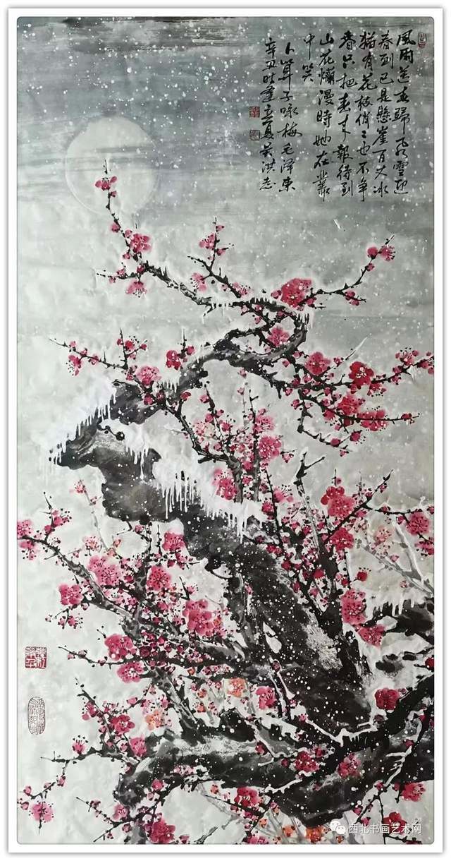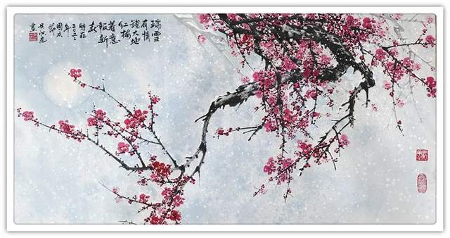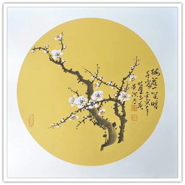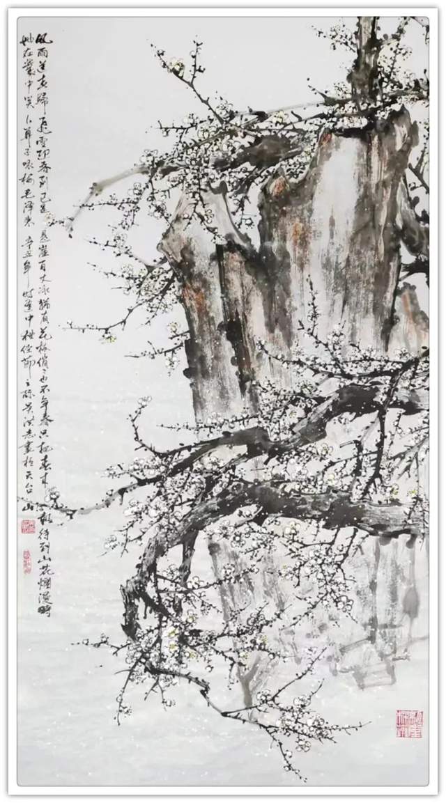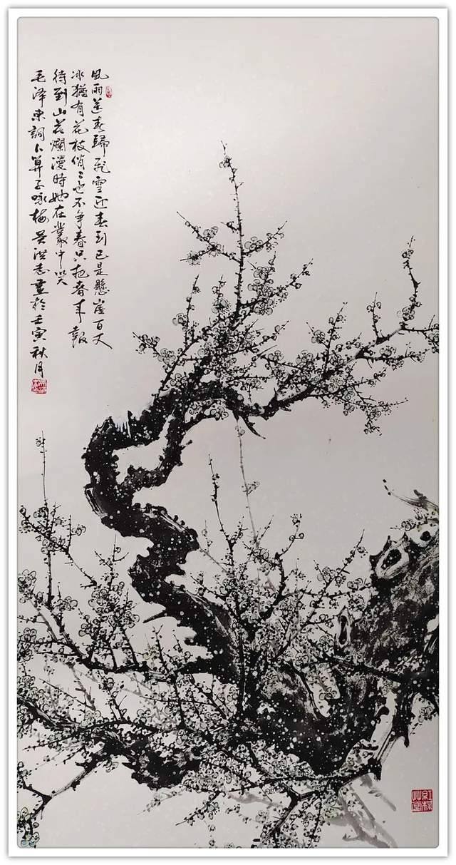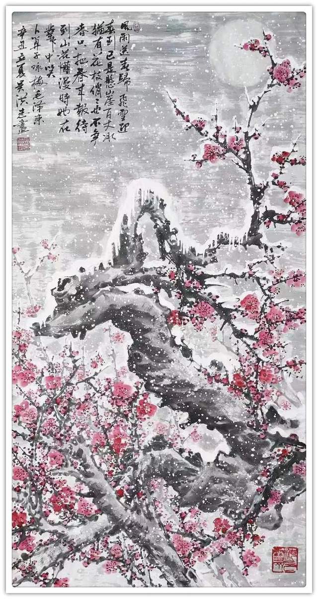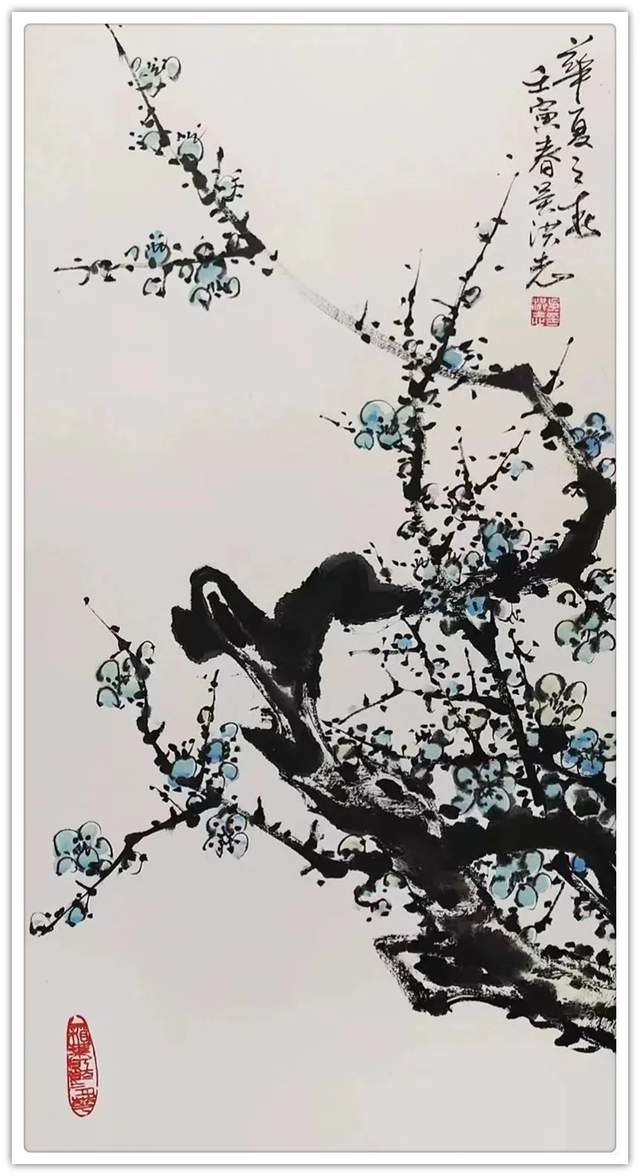 吴洪志喜欢画梅花是因为他从小长在山村梅花坞中,是这座梅花山的灵魂给吴洪志留下了深刻印象,吴洪志笔下的梅花应该是这样漂亮。当然,他也不是凭空幻想。山村地头老梅树的铁干虬枝,茅舍旁边梅海茫茫,香气扑鼻而来,香飘万里,使人感到心旷神怡,让人难以捕捉。这些美,构成了吴洪志画梅花的灵魂!