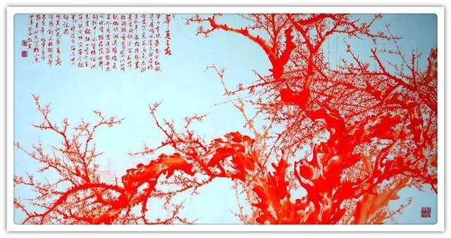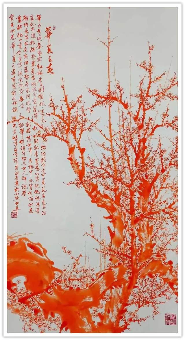 看了吴洪志的一幅幅梅花气势磅礴,浩然正气!体现了吴洪志画梅花需要的是热烈的,令人振奋的,铁骨铮铮的中华民族精神。于是吴洪志把一棵棵梅花树想成一个宏大的场面,一朵朵花想成一面五星红旗,永远在人民的心中飘扬,象征着中华民族的千年横空似龙的老干,在中国的大地上跃然而起!体现一派生机活力,愈挫愈奋、坚忍不拔的奋斗精神。