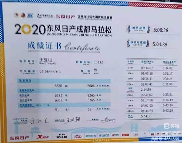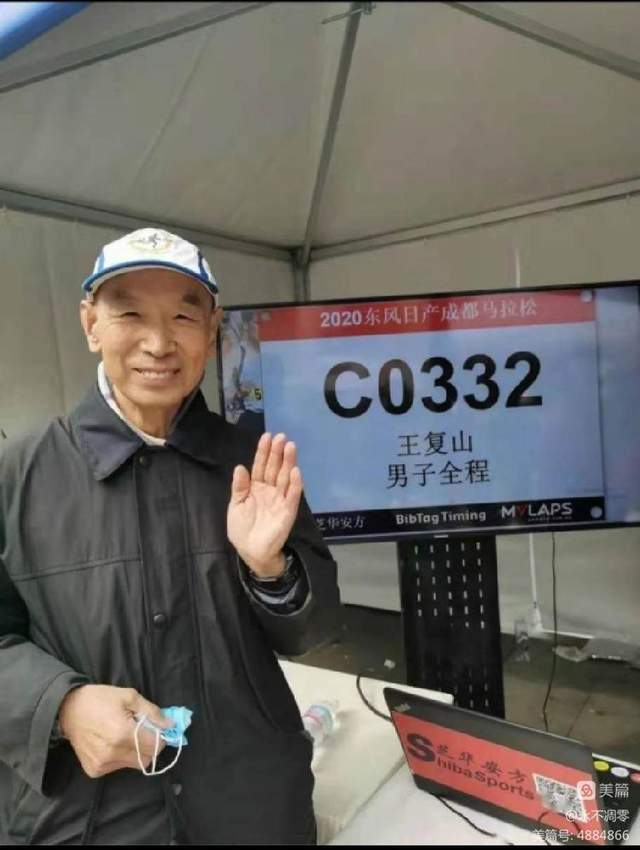 再看!2020年成都马拉松,81岁的王复山5小时04分顺利完赛。