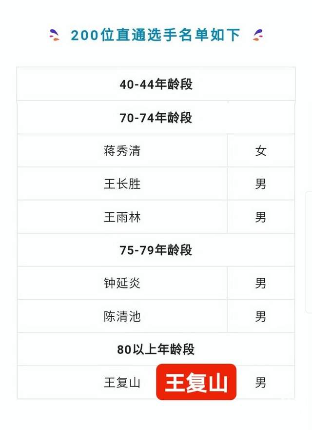 继续看!从成都马拉松跑向世界!直通世界马拉松大满贯的200名跑者名单公布,令人振奋的是,80岁以上的只有一人,他就是王复山。