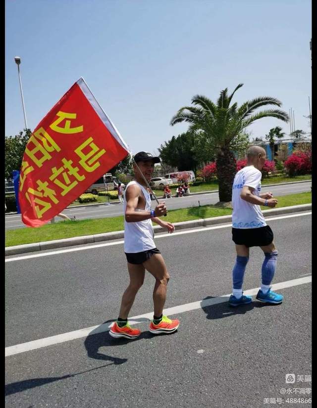 再来看!这是2021年4月10日厦马40公里处,扛着“夕阳红”旗帜的崔爱国和他身后82岁的王复山。