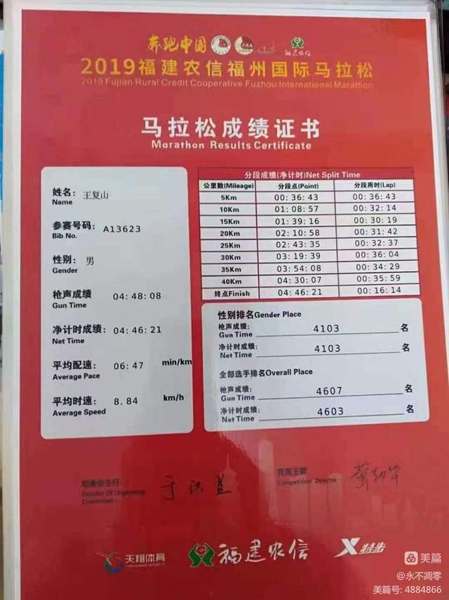 看!2019年,福州马拉松,80岁的王复山4小时46分安全完赛。