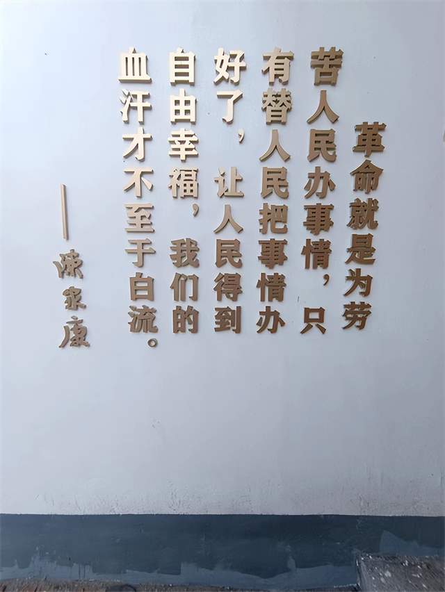 现将陈家康故居墙面上镌题着他的一句至理名言:“革命就是为劳苦人民办事情,只有替人民把事情办好了,让人民得到自由幸福,我们的血汗才不至于白流。”