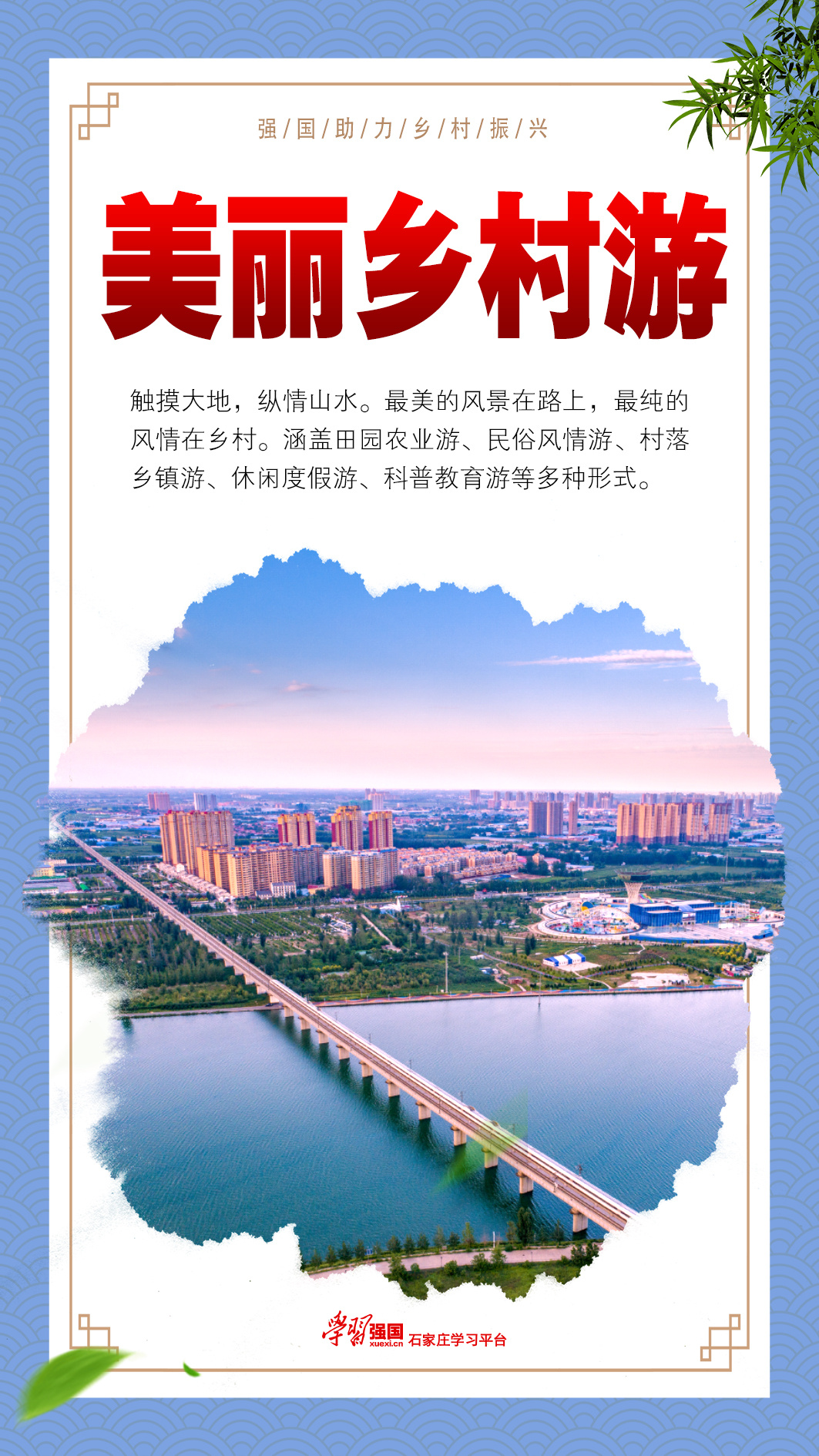 美丽乡村游:触摸大地,纵情山水。最美的风景在路上,最纯的风情在乡村。涵盖田园农业游、民俗风情游、村落乡镇游、休闲度假游、科普教育游等多种形式。