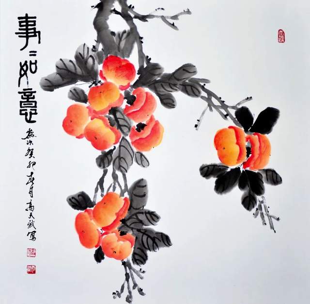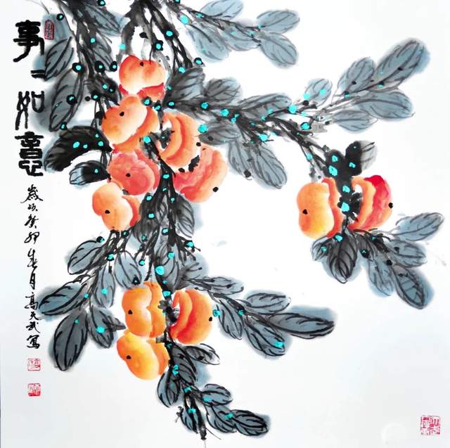 高天武老师说:“这两幅幅写意柿子图,分享一下。柿子,是秋季的水果,有着古老的历史和文化意义。在我的画中,我以自然的姿态表现了柿子的形态,用淡墨浓染的手法表现出柿子的质感和光影效果。我选择了典雅的传统颜色作为底色,配以清新自然的绿叶和壮实的枝干,整个画面充满了自然与生命的韵律。希望我的画能让大家感受到自然之美和传统文化的魅力。”