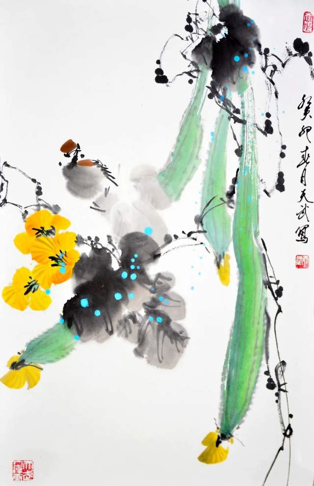 《三思图》作品,让我们看到了一只麻雀停在三条丝瓜上,形成一幅生动有趣的写意画。望着这幅画面,我不禁深深思考,生命中的每一个选择,都需要三思而后行。