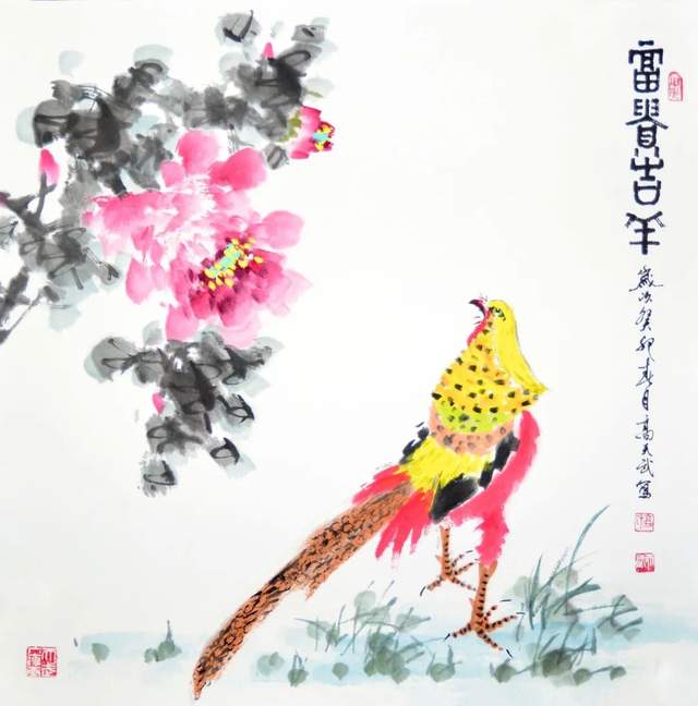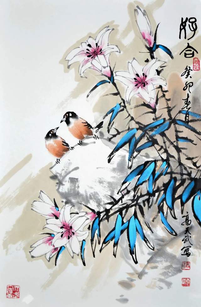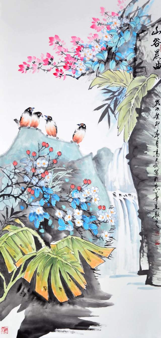 从他的作品中,我们不仅可以看到花鸟的神韵和灵动,更能感受到山水之间的和谐共生。在高天武先生的笔下,花鸟不再是孤独的存在,它们与自然融为一体,共同构成美丽的画境。