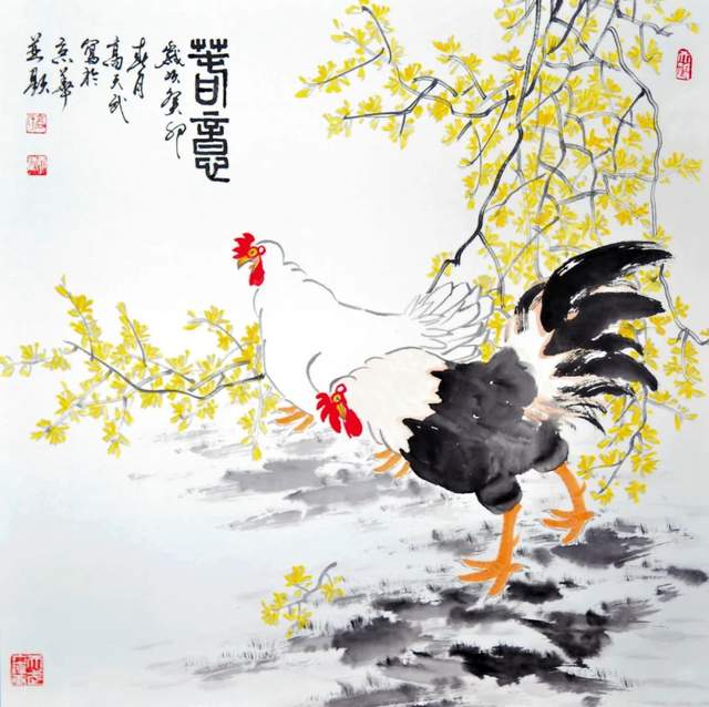 《春意》一幅大写意国画-迎春花下一对鸡。画面中,两只鸡在迎春花下尽情嬉戏,快乐自由。画师将两只鸡生动表现出精神奋发、张扬自信的状态,让人感受到春天的美好与希望。迎春花绽放,为新的一年塑造新气象。鸡表示了勇往直前的精神,寓意着新的一年,我们要积极向前,奋力拼搏,收获不一样的翻天覆地的变化。