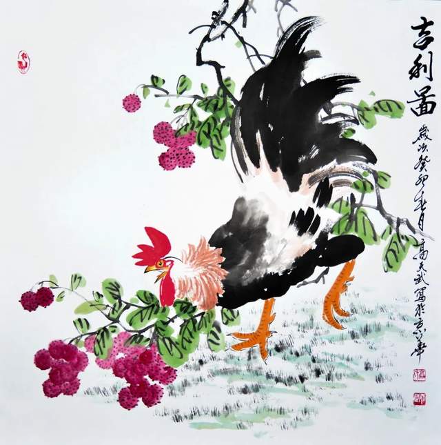 这幅画真是太惊艳了!一只自在挺立的雄鸡和饱满甜美的荔枝画在了一起,令人心驰神往。雄鸡作为中国文化中的吉祥物,常常被用来象征好运和成功。而荔枝则是中国南方常见的水果,同时也被视为幸福和繁荣的象征。这两者的组合让这幅画更具有了中华文化的特点。从传统的写意手法来看,笔墨精致而别具一格,呈现了中国传统文化的韵味;而从现代审美的角度来看,图案的布局具有一种别致的美感,不仅仅是一幅画,还是一份独特的艺术品。希望这副画带来的吉利象征会一直陪伴着您,为您带来幸运和福气。