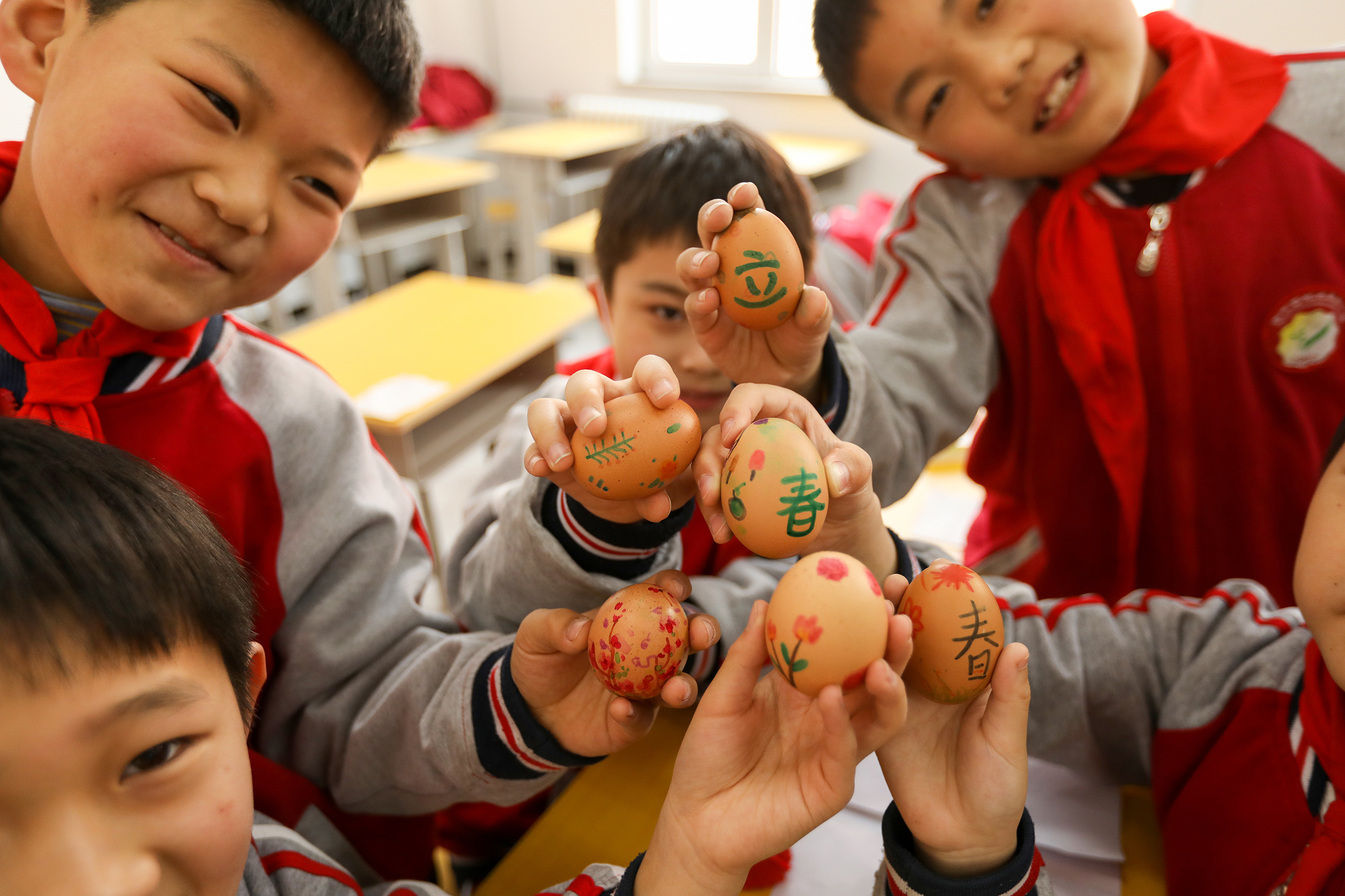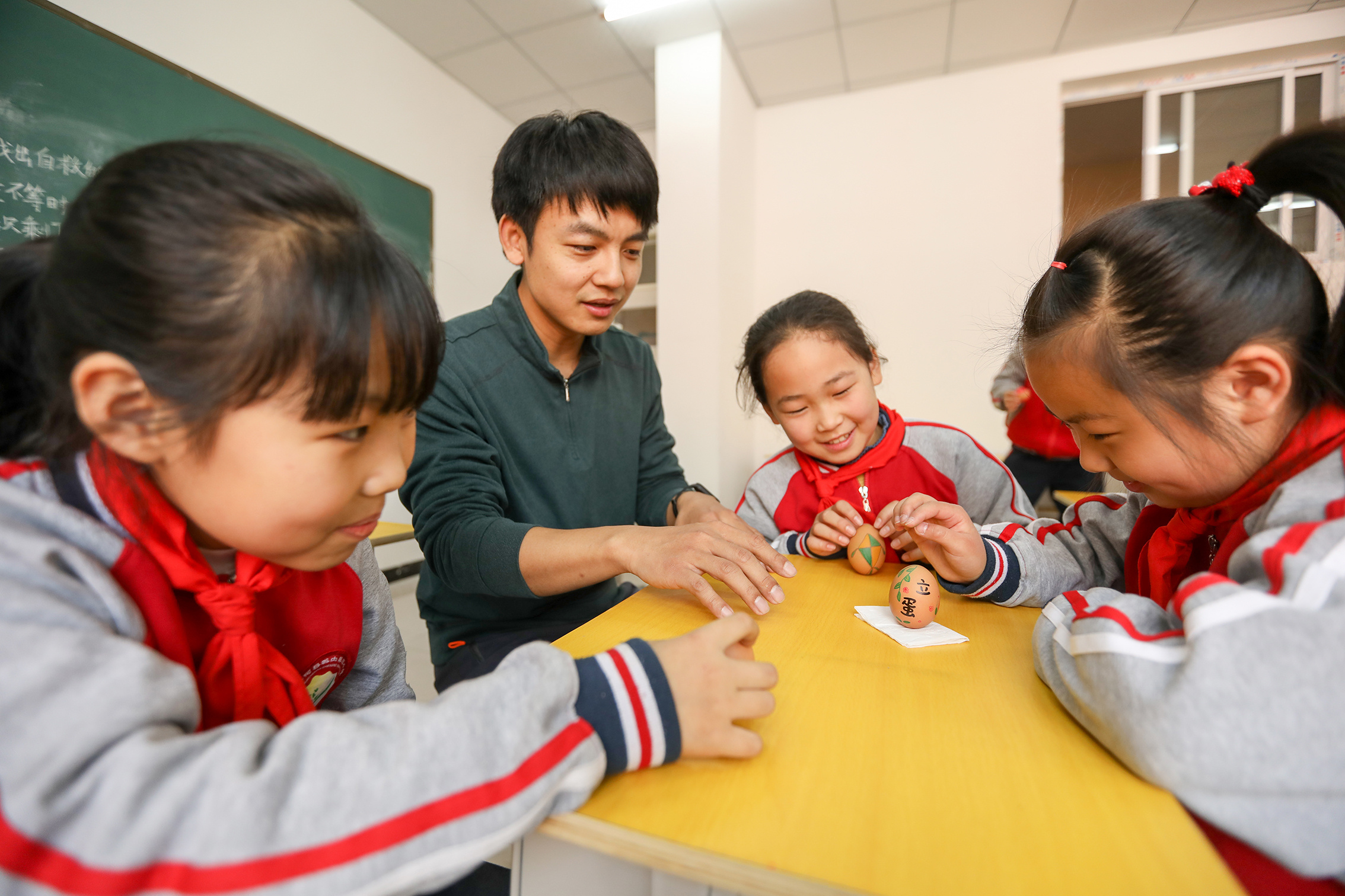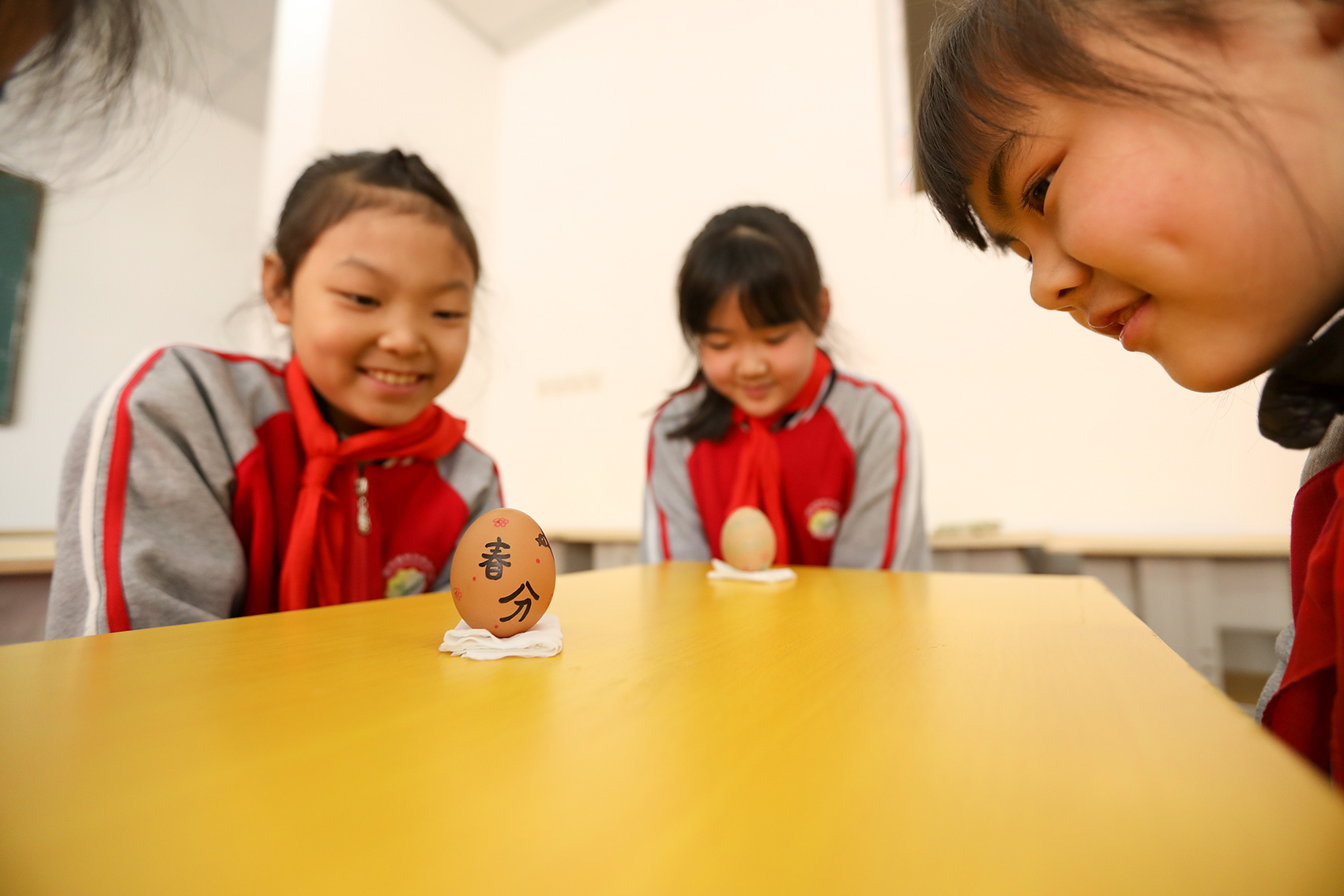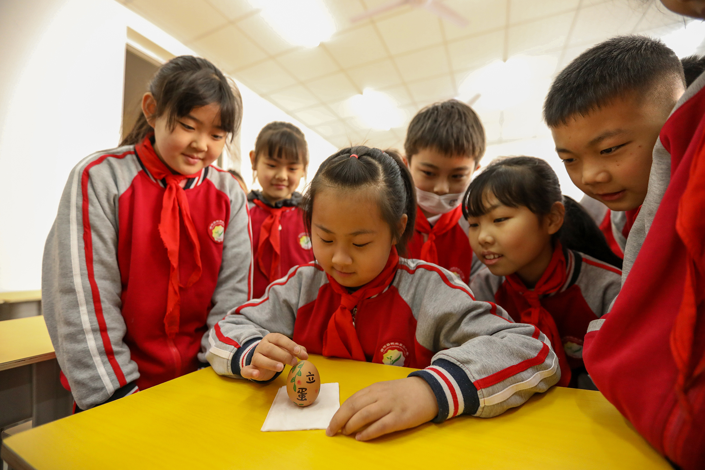 “快看快看,我的鸡蛋立起来了!”教室里瞬间爆发出激动的欢呼声,河北廊坊香河县城内第三小学的学生争先恐后地看着这个神奇的鸡蛋却又怕把它碰倒了。