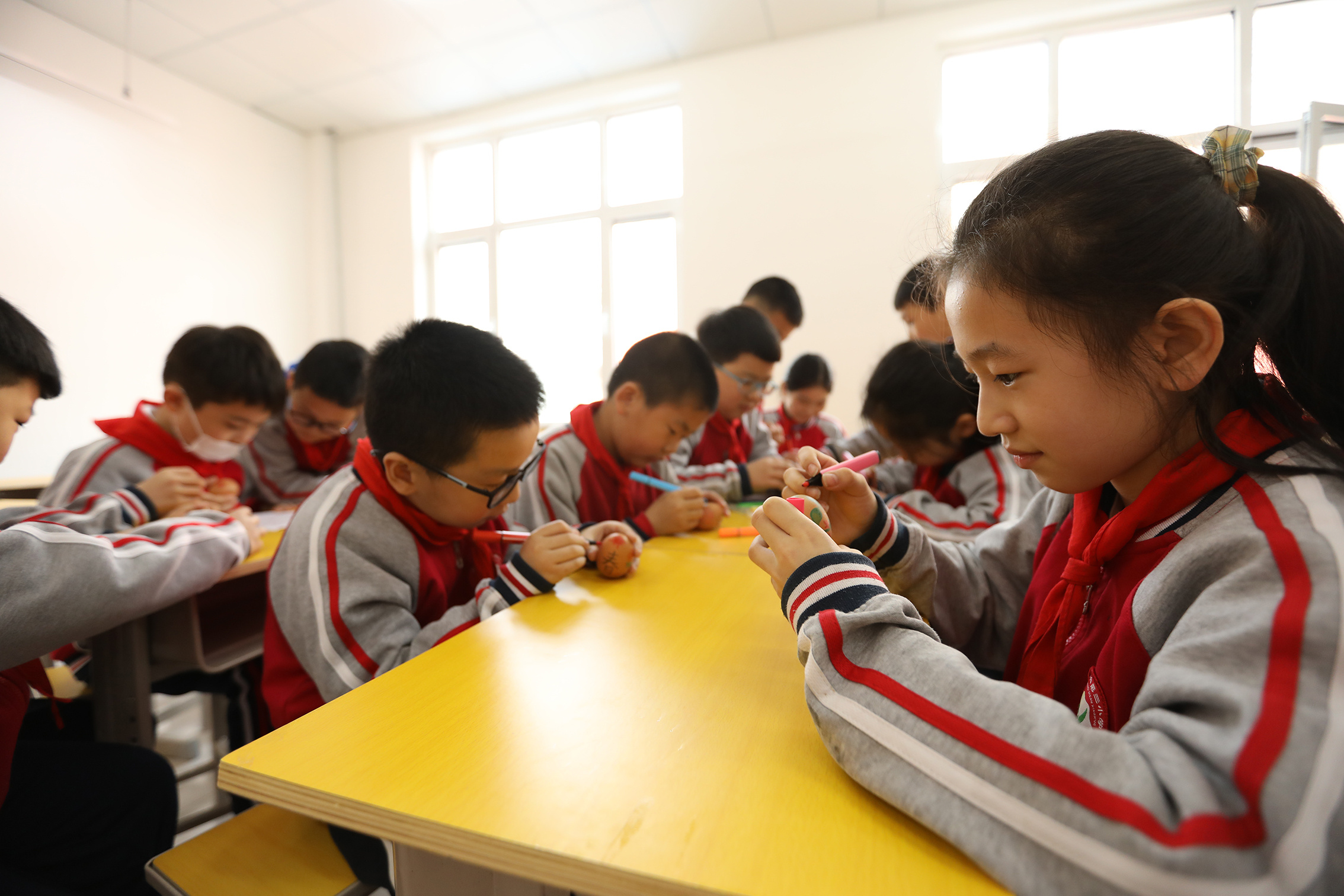 孩子们在认真地彩绘鸡蛋。