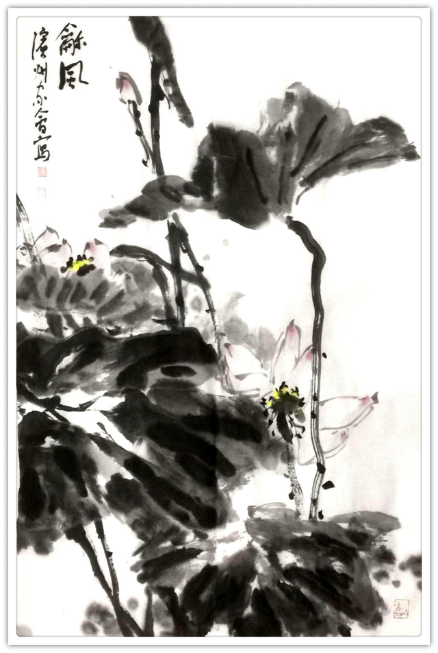张家会的荷花,多见秋荷、残荷。他笔墨洒脱,浓淡相宜,繁杂中蕴含章法,墨色里饱含韵律。所画残荷,枯枝清奇,败叶曼妙,错落有致,一种凄寂之美,阐释出文人清高淡雅;秋荷,落墨淡然,如云似雾,叶片交合,繁复中蕴含空灵,水墨交织间尽显清秋之美。荷间,往往有几只水鸟,或引颈高歌、或俯首觅食、或信游水面,寥寥数笔,姿态各异,使画面顿生灵动之感,为荷的禅意,注入了文人孤高、典雅、纯洁的情致。