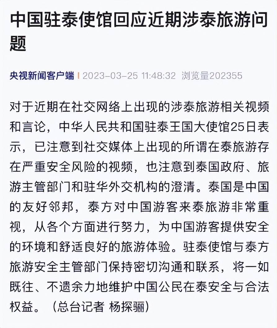 中华人民共和国驻泰王国大使馆25日表示,已注意到社交媒体上出现的所谓在泰旅游存在严重安全风险的视频,也注意到泰国政府、旅游主管部门和驻华外交机构的澄清。
