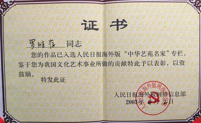 加拿大华人艺术研究院评为世界华人资深美术家荣誉称号。作品鸿雁图一顺百顺在美国长岛大学展出,被永久珍藏。书法(龙)字参加世界华人榜书大赛获“金龙”奖。人民日报海外版“中华艺苑名家”专栏颁发“中华艺苑名家”荣誉证书。