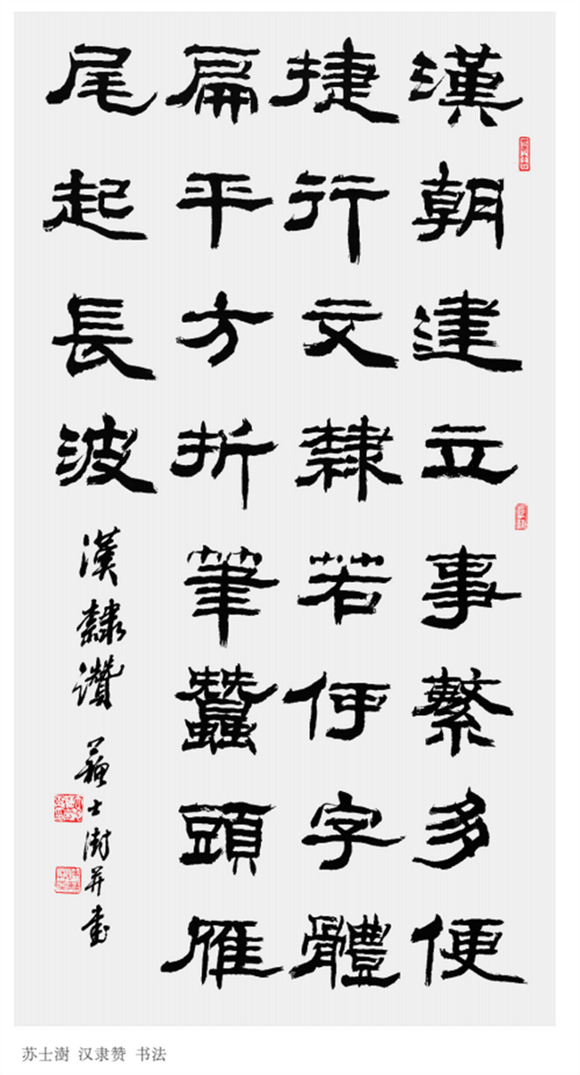 其篆书雄浑厚重,含蓄深沉,氤氲着金石之气;隶书从汉碑入手,一笔一画,绝无苟苟;其行书飘逸洒脱,如行云流水。他还长于篆刻、治印,其篆刻作品笔势流畅,婉转清丽,而又不失朴拙大气之本色。苏士澍的书法、篆刻艺术创作既能谨遵法规,又能不断超越。其艺术作品的内容蕴含着强烈而新颖的时代感,形式则于严谨、平和的法度之中,糅入文人式的旷达放逸,形成一种富有深厚人文底蕴而又极具浓厚书卷气的独特美感。尤其值得注意的是,苏士澍的书法、篆刻艺术创作较好地将中国书法的传统形式与时代精神结合起来,以超越流俗、勇于创新的精神对传统书法形式与当代文化在题材内容、视觉美感上进行重构,完美地体现出中国传统文化置身于当代文化环境中的鲜活生命力,真正做到了“别开临池路一条”。