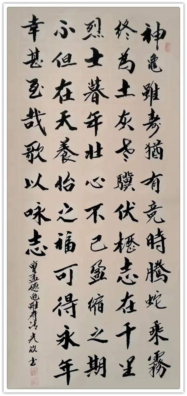 在职期间除做好本职工作外,认真学习古帖,笔耕不辍。退休后认真临帖并深入钻研二王的行书、颜真卿的楷书、汉代张迁碑的隶书,形成了自身书法的运笔自如、潇洒大气、端庄稳重的特点。