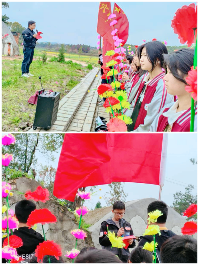 英雄事迹报告结束后,学生代表深情发言,立誓好好学习,为实现中华民族伟大复兴奉献青春力量,不愧先烈们的英勇付出。最后全体师生向革命烈士敬献白花,绕烈士墓碑一周,瞻仰先烈的丰功伟绩。