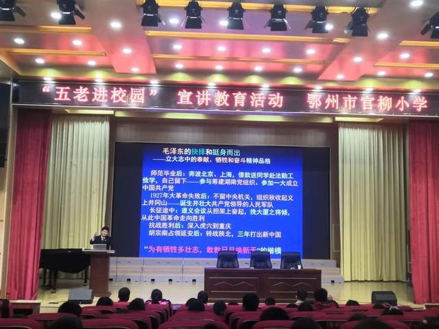 为进一步让师生了解党的光辉历史,激发师生爱国热情,厚植红色基因,弘扬中华优秀传统美德,3月30日下午,鄂州市官柳小学在报告厅开展“五老进校园”暨道德讲堂宣讲活动。