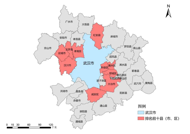 ▲融入武汉发展指数排名前十县(市、区)空间分布