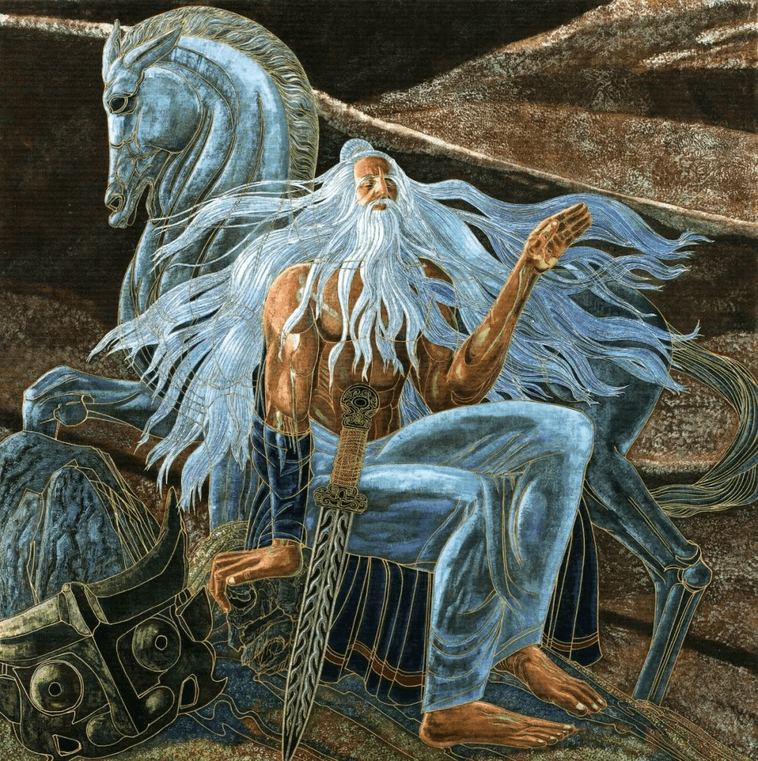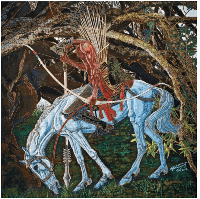 我当时就想到了岳飞的一首诗,《三十功名尘与土》就好像三十年的功名像尘土一样消失了。我在画这张画时,我觉得头发胡子眉毛都混在一起,这是很气概。另外画的身体非常的魁梧强壮,表现一种男人的一种生命力。人老了精神应该不老。画的手势是一种天问,问天问地问自己。在否定自己的过程中不断往前走,否定了肯定,肯定了否定,不停地循环往上走,在痛失自己的过程中精神升华,会在更高的一个高度上。我在画这张画的时候开始思考:想到屈原讲的那句“路漫漫其修远兮,吾将上下而求索”,问天问地问自己,这人应该觉醒。