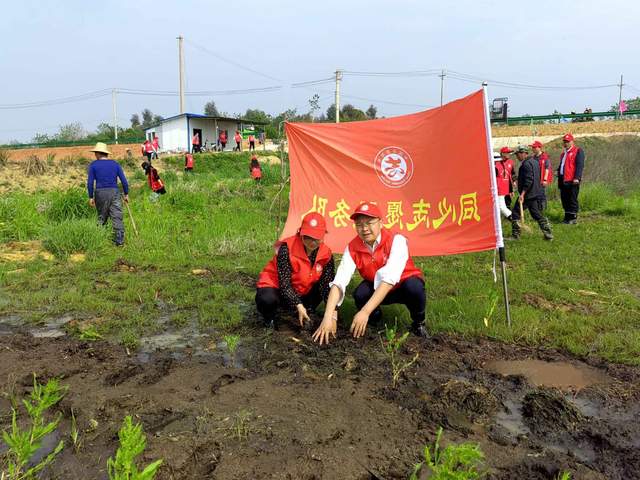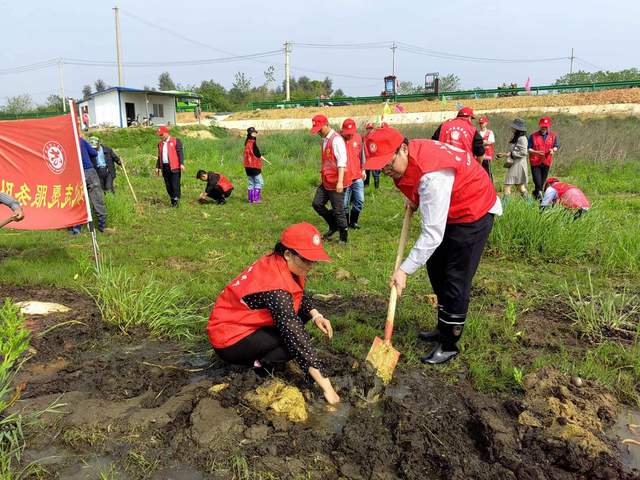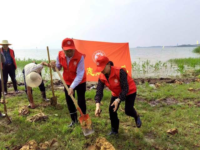 前来参加“民进•同心爱水护湖实践基地”揭牌仪式的市政协副主席、民进鄂州市委会主委谈春光,民进鄂州市委会副主委李波,区政协党组书记高爱民,区委常委、办公室主任王伟,区人大副主任宋琪,沼山镇党委书记熊新华等领导,与民进梁子湖支部会员、区镇志愿者、楠竹村村民一道植莲藕。