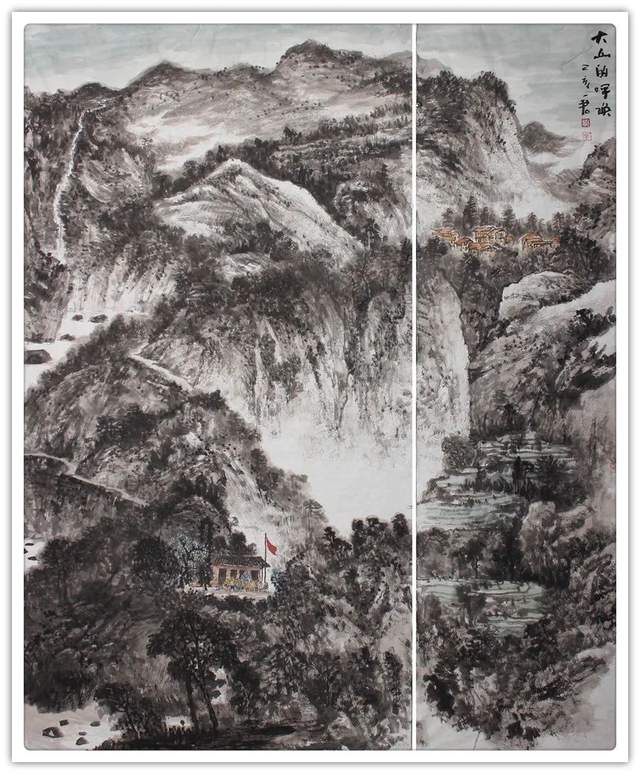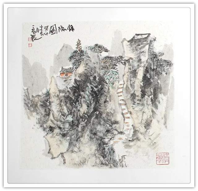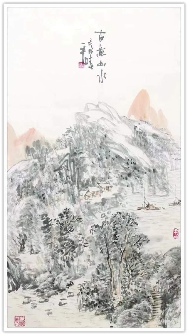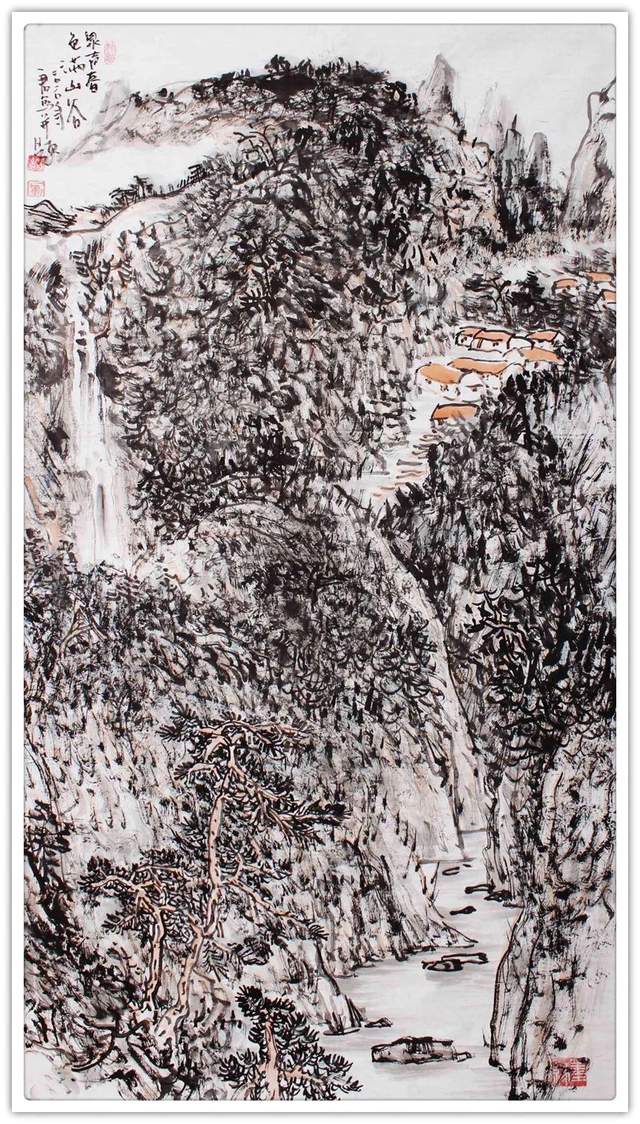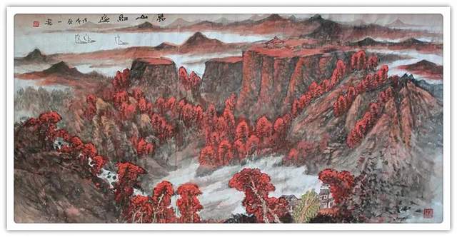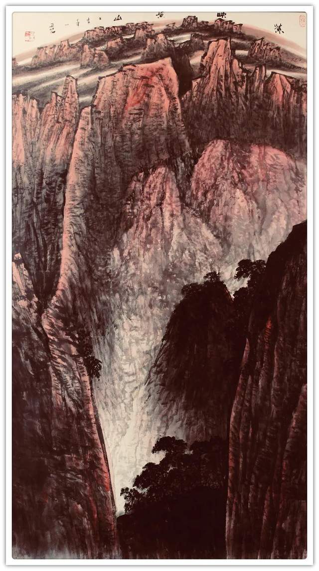 刘一军先生的山水作品,都以精神为核心,全因浑厚而 惊艳。走进他的山水世界,浑厚华滋入梦来,移步换景游乾坤。紫映黄山写雄秀,万山红遍华山险。依骨法用笔,写千山万水, 孤舟一去,青山隔水。他不把自己闭锁进一间画室里臆画山水, 有相当执着的写生精神。走进山水实况,独与天地精神往来, 写意山水便有了笔下应物象形作丘壑,心中气韵生动写烟岚 的成竹在胸。兴来可豁胸中志,执笔畅神写气概。刘一军先 生的山水作品,在画里画外泊蓄下引人入胜的美学力量,让 人一看既会赏心悦目,果真是外师造化中得心源的神品!