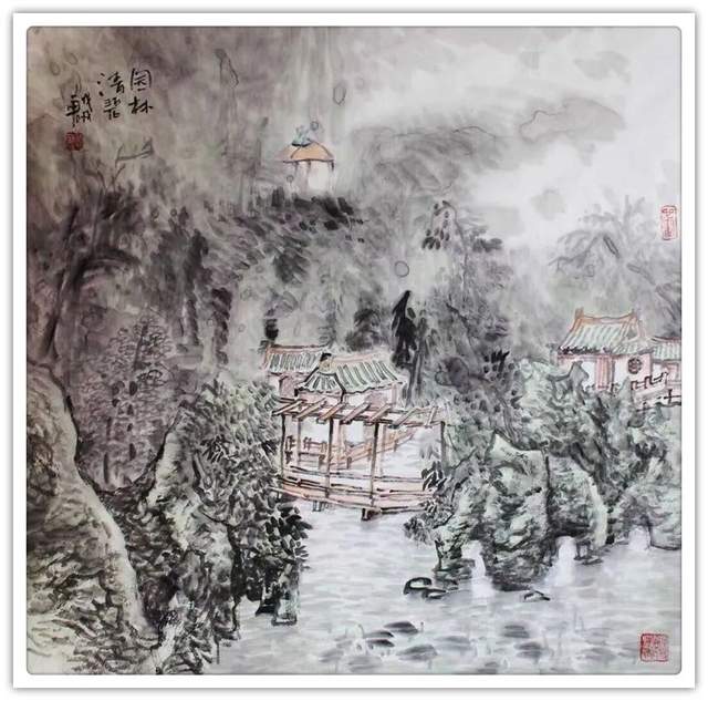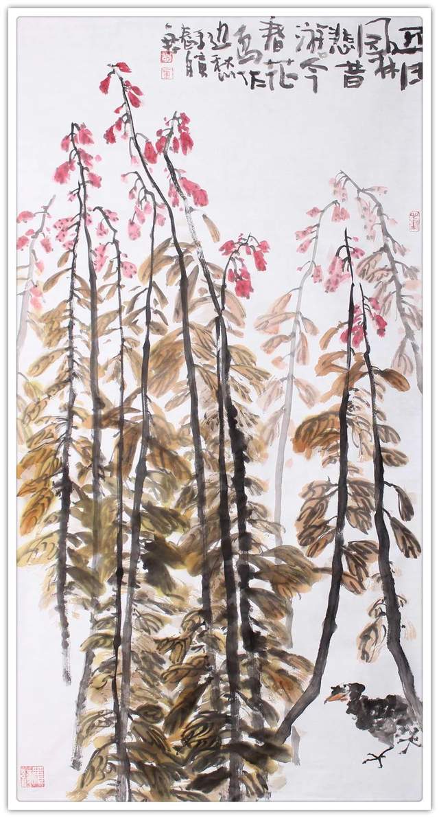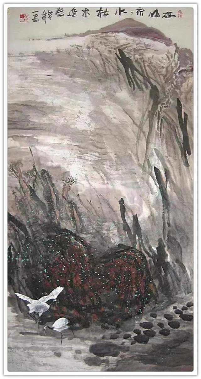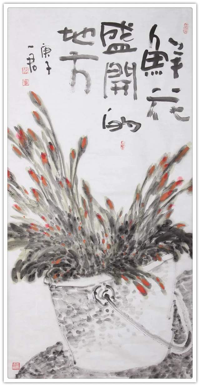 经由山水观赏,转阅刘一军先生的花鸟创作,亦有浑厚 的审美印象。从大处落笔,毫不拘泥。小心收拾,绝不粗糙。执笔在手,运笔在心,带着掠物象之精神的激发张力,写下 夺物象之体貌的形神兼备。无论是《鲜花盛开的地方》《近 日园林悲昔游》都是有精神、有见地、有力量的丹青上品。在家居雅厅挂起这样一件作品,顿时蓬荜生辉,可以涤尽一 切糜糜之气,让家居空间焕发出勃勃力量。所以刘一军先生 的美术作品可以装饰万家屏障,拥有不可低估的收藏价值潜 力。