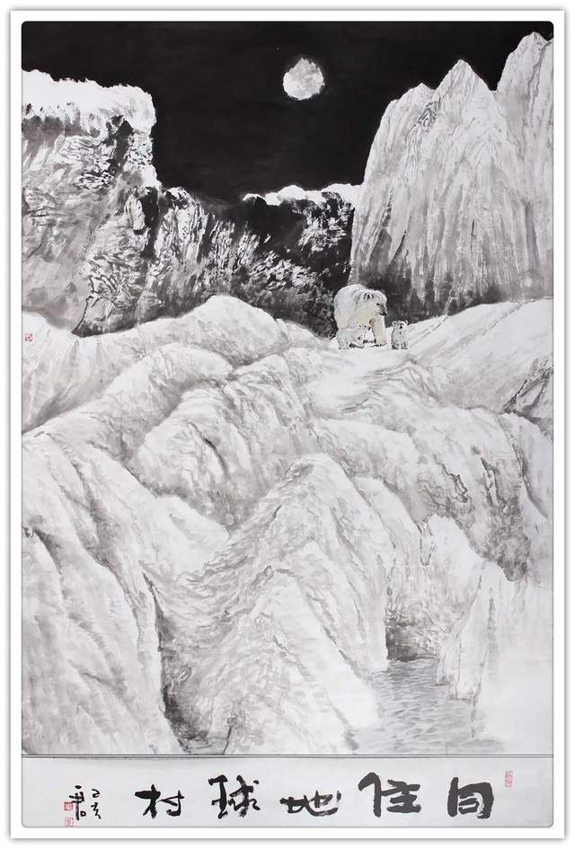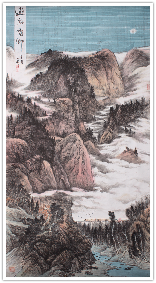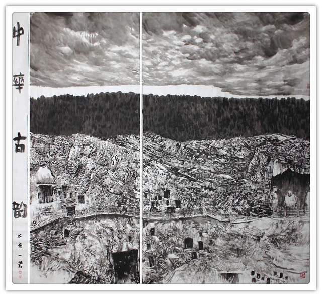他用一支可作钢打铁铸的画笔,一气呵成极具美学个性 的《中国龙》。画面情景附观长河落日,感叹大漠孤烟,充 满了中国文化自远古来,向未来去,生生不息的内生动力。刘一军先生写意山水奇观,借古开今,一举挣脱了旧有范式 的拘泥。以苍天视角画下神州虬龙,以物像寓精神,以空间 作格局,万里河山今尤在,壮怀激烈新姿态!中国,最需要 有这样一件走向世界的精神图腾,刘一军的作品是展示中国 精神、弘扬中国精神的弘钟大吕,是可以挥斥方遒的艺术方鼎!
