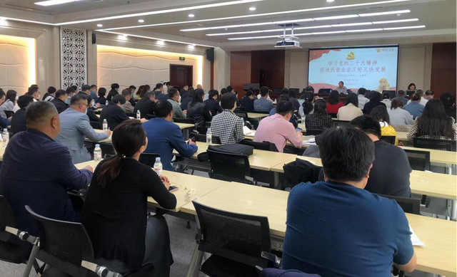 片区党委党建指导员田兆广为大家做了《学习党的二十大精神,促进民营企业又好又快发展》的主题宣讲,在历时一个小时的演讲中,田兆广书记从九个方面对二十大报告作串讲辅导:一是深刻领会党的二十大的主题;二是深刻领会过去5年的工作和新时代10年的伟大变革;三是深刻领会开辟马克思主义中国化时代化新境界;四是深刻领会新时代新征程中国共产党的使命任务;五是深刻领会中国式现代化的中国特色和本质要求;六是深刻领会社会主义经济建设、政治建设、文化建设、社会建设、生态文明建设等方面的重大部署;七是深刻领会教育科技人才、法治建设、国家安全等方面的重大部署;八是深刻领会国防和军队建设、港澳台工作、外交工作等方面的重大部署;九是深刻领会坚持党的全面领导和全面从严治党的重大部署。
