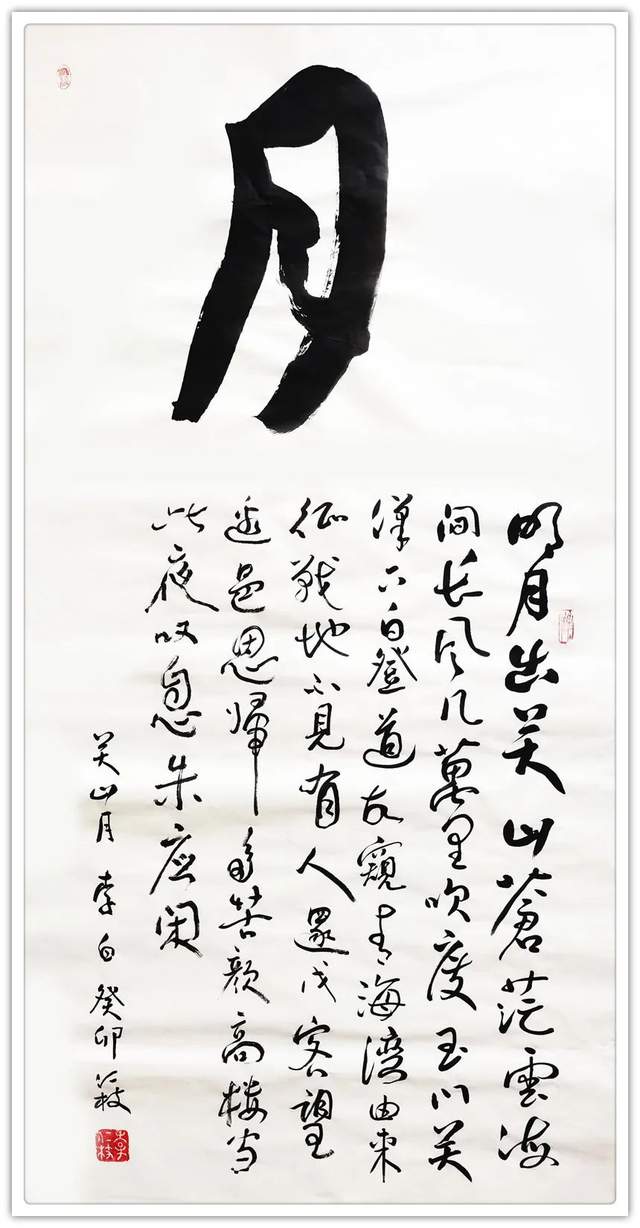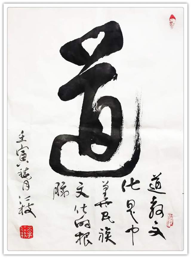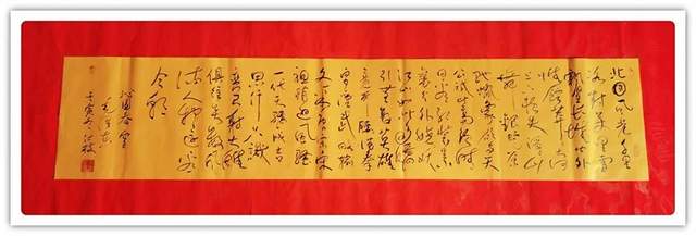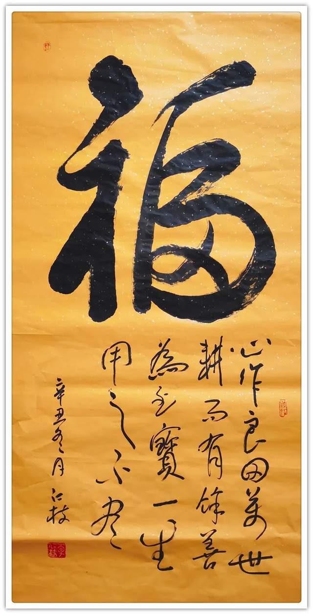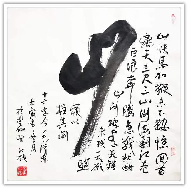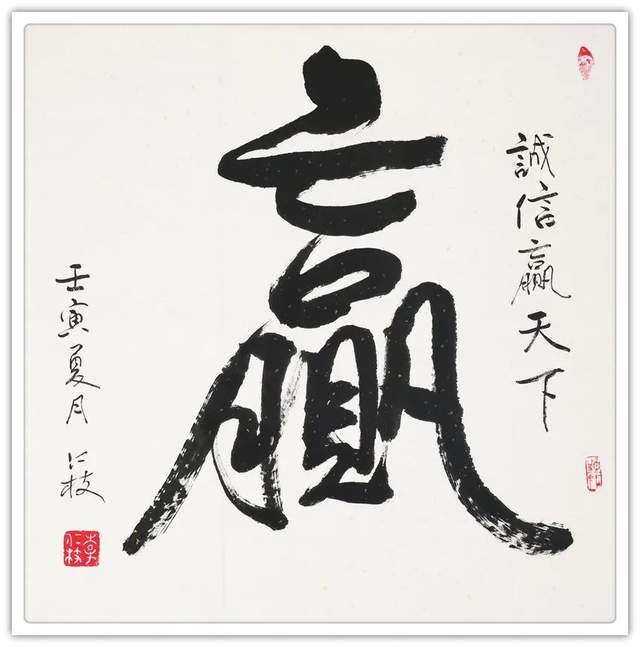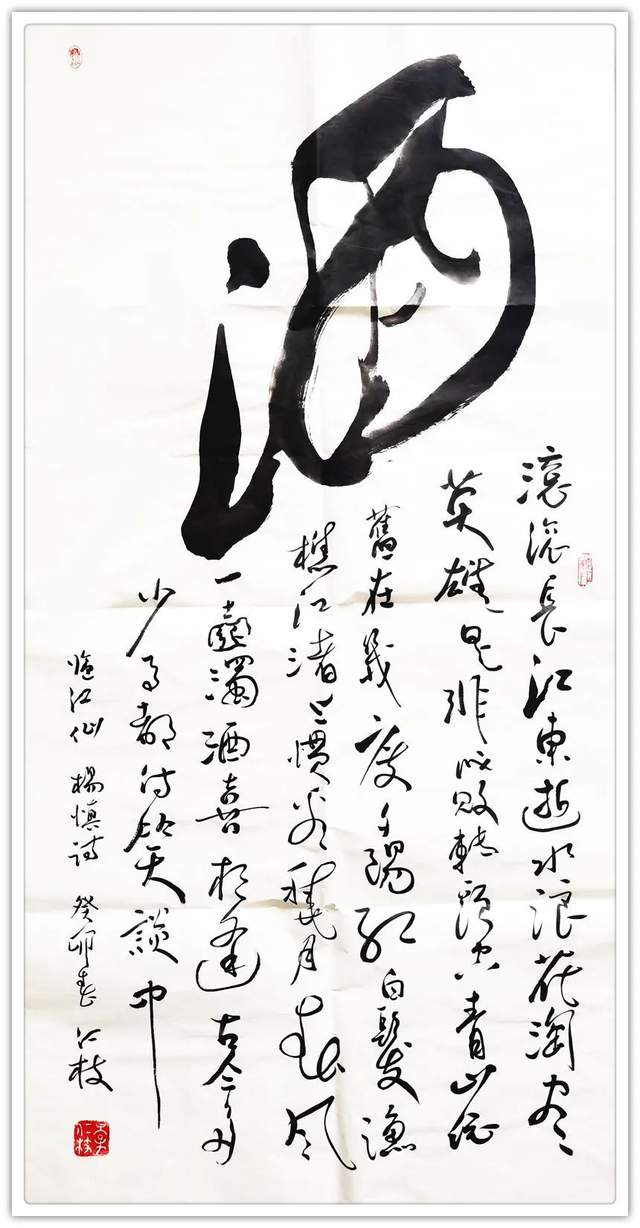 其书法直取自然万象入书,大气磅礴,匠心独具。其作品大开大合而不失肃穆儒雅,潇洒飘逸而不失浑厚稳重,痛快淋漓而不失规矩法度,实可谓动中寓静,以静致动,静以动美,动因静生,妙趣无穷,苍劲有力,气度非凡,美不胜收,有滚滚风云一泻千里之势,自成一体。