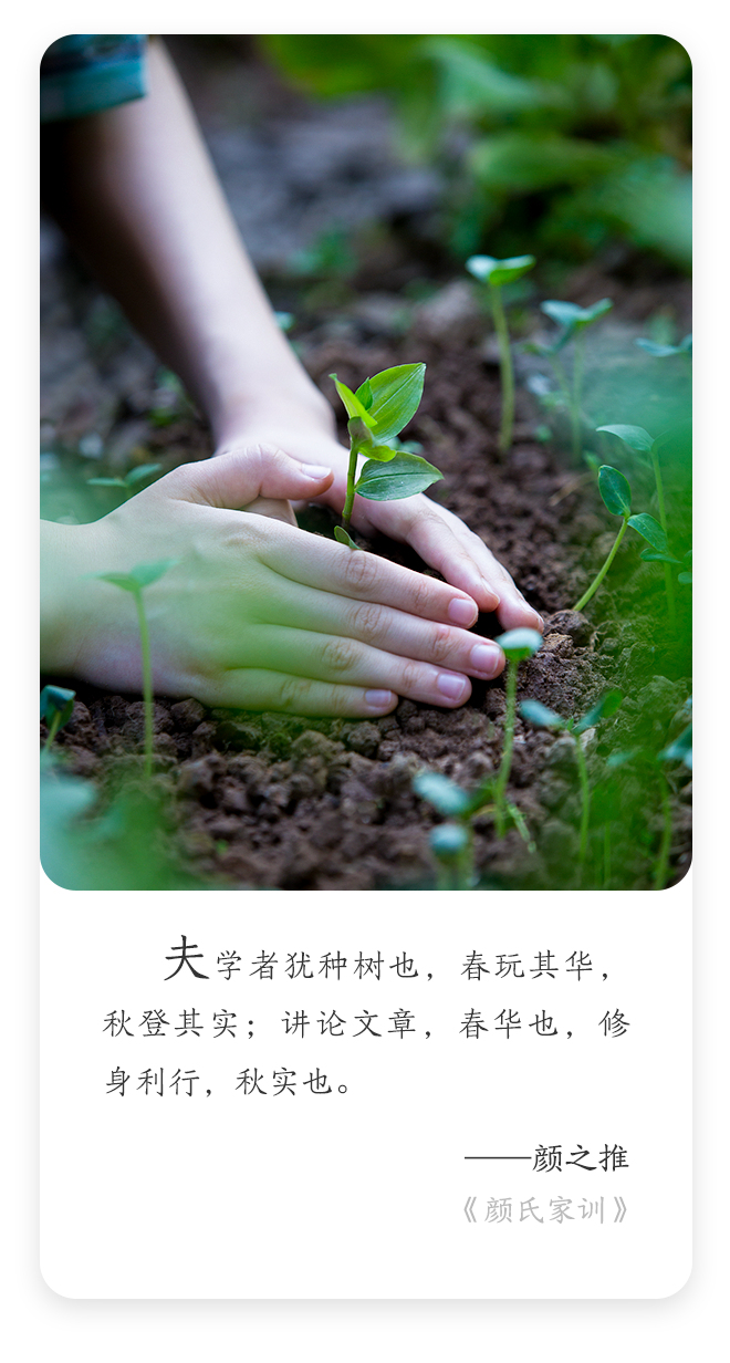 颜之推,南北朝时期的文学家、思想家、教育家,代表作有《颜氏家训》等。此句意思为,学习就像种树一样,春天开花时欣赏其花叶,秋天成熟时收获其果实。讲论文章,就像品赏春天的花叶;修身践行,就像收获秋天的果实。
