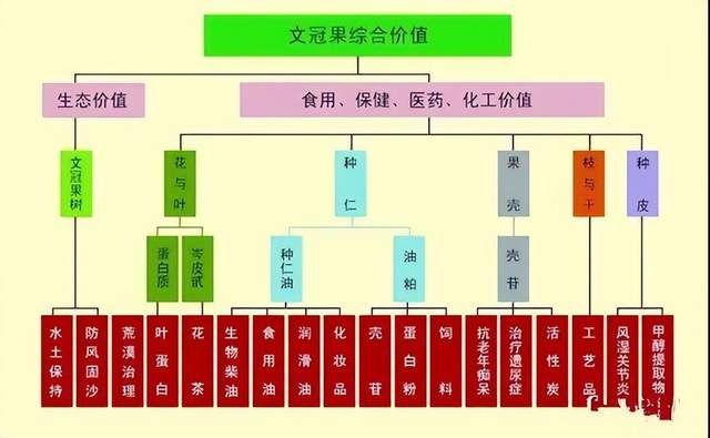 一般植物只有一样用处,只能做一个产品,而文冠果粗略说有很多作用和产品,细说有数百样作用和产品。文冠果最重要的东西是果子,果子里面最重要的东西是种子,种子里面最重要的东西是文冠果油,油里面最重要的东西是神经酸,神经酸是大脑黄金,是黄金的三倍价格。