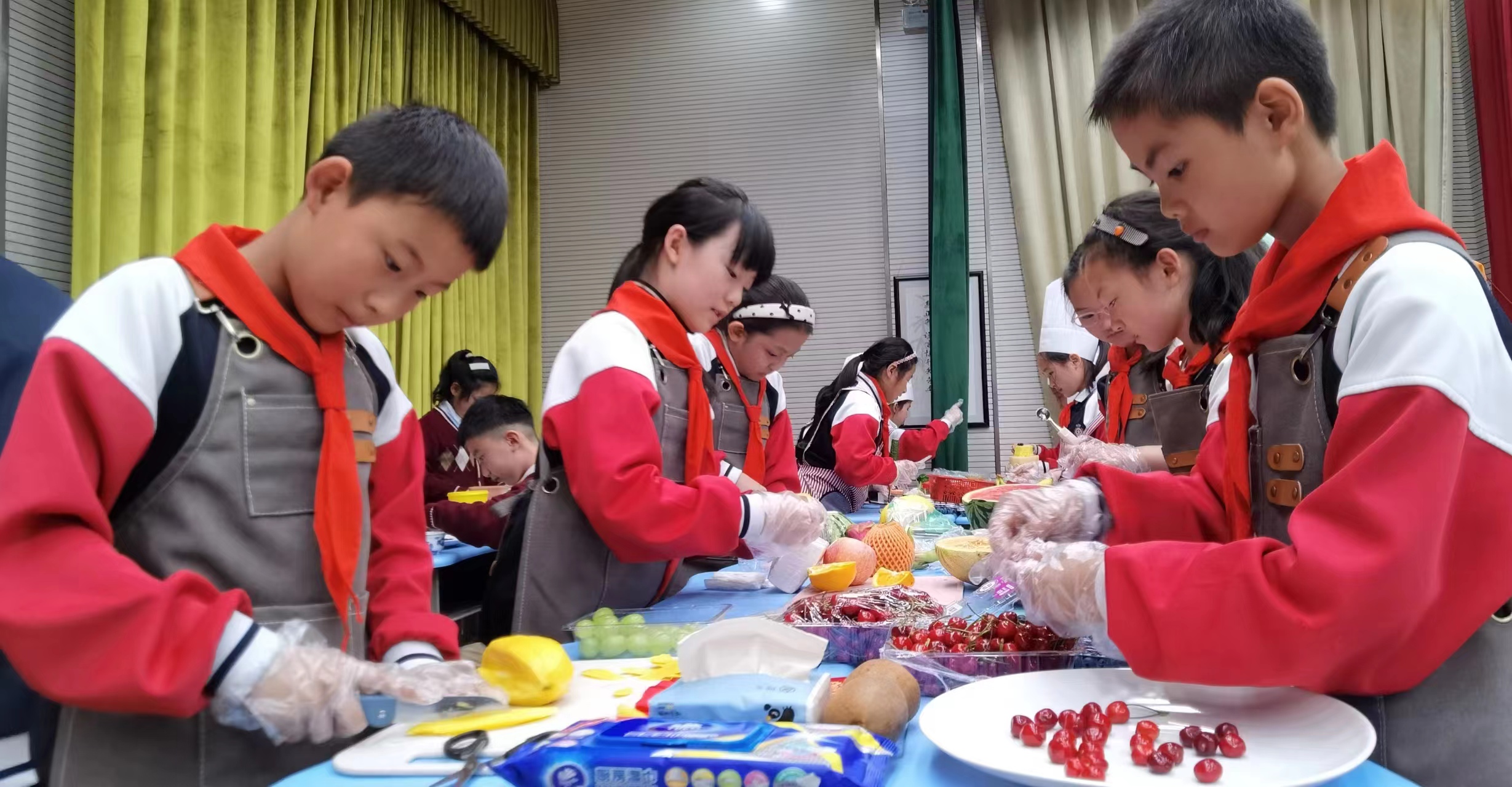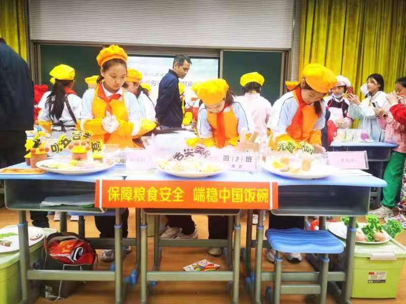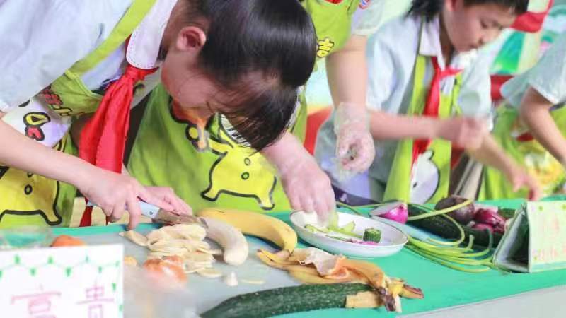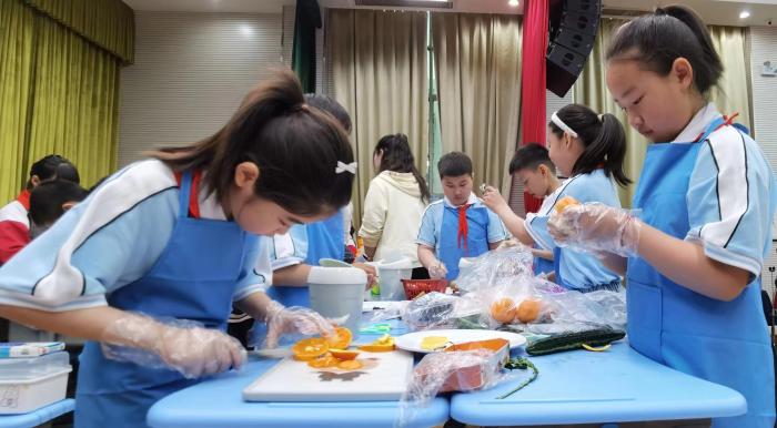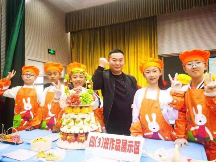 一年级穿、脱叠校服 + 剥蒜、二年级穿、脱叠雨衣和系鞋带比赛,随着评委老师的一声令下,比赛正式开始,同学们个个动作娴熟,把校服、雨衣摊开,扣上扣子,然后折叠、压实、整理、全神贯注地叠着衣服,在选手们灵巧的小手下,校服被整齐地叠放在桌面上。系鞋带比赛中一只只拿着鞋带的手在鞋子上飞快地穿梭,动作迅速而灵活,一根根鞋带经过孩子们的手,很快就在鞋子上变成了漂亮的蝴蝶结,名副其实生活小达人;三年级蔬果创意拼盘、四年级面点秀比赛,小厨师们使出浑身解数,忙得热火朝天。削皮、切割、摆放,经过孩子们精心的设计,巧妙的制作,别出心裁的摆盘,制作出令人惊艳的作品。面点制作也要讲究创意,孩子们利用手中面粉制成各种面食,精致的摆放赢得评委的好评。一盘盘美食,一道道“拿手好菜”,争“香”斗艳,直让人垂涎欲滴,大家捧着自己的劳动成果,脸上露出灿烂的笑容。比赛结束后,孩子们和班级小伙伴一起分享美食,并根据自己的经验,相互讨论如何把手艺更加精湛;五、六年级走近各种职业,体验各种劳动者的工作。同学们结合自己的认识,充分体会到了各行各业劳动者的艰辛苦和快乐。