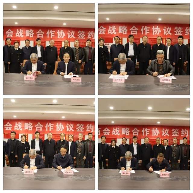 会上,太原市温州商会与太原市南安商会、太原市邯郸商会、太原市达州商会、太原市人工智能协会本着“增进友谊、促进合作、互惠互利、共同发展”的原则签订了友好商会合作协议,并合影留念。
