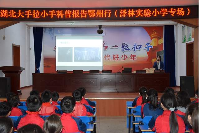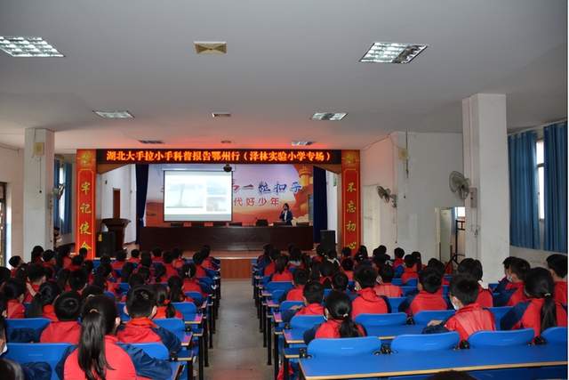 中国气象局干部培训学院湖北分院高级工程师、湖北大手拉小手科普报告团专家汪应琼以“气候变化与我们”为题,用深入浅出的语言、大量图文和翔实的数据为学生们普及了与我们生活息息相关的气候特征、气候变化和气象灾害的成因、影响等内容,深奥的气象科学瞬间变成了同学们看得见、学得会、用得着的生活知识,整堂讲座集知识性、科学性和通俗性一体,趣味性、新颖性和针对性强,受到了师生们的热烈欢迎。