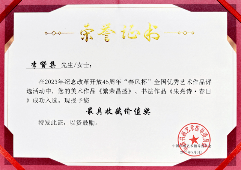 本次活动评审工作已经于5月7日圆满完成,为了保证本次活动评选客观、公证,在评选程序上,采取组委会初评、专家复评和评委会终评的程序,最终入选优秀作品共计131件,其中美术作品50件,书法作品61件,工艺作品15件,诗词散文作品5件。世界纪录艺术家李赞集书法和美术作品入选中,并荣获2023年“春风杯”全国优秀艺术作品评选 “最具收藏价值奖”,颁发荣誉证书,入选作者名单已在人民日报媒体公布。