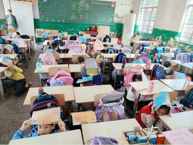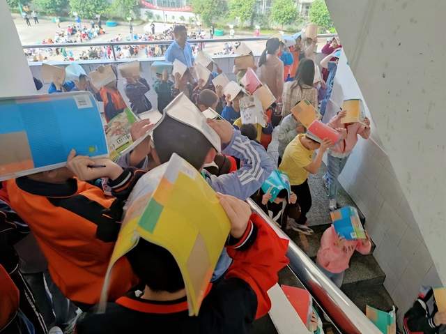 演练开始,警报声响起老师指导学生紧急避险
