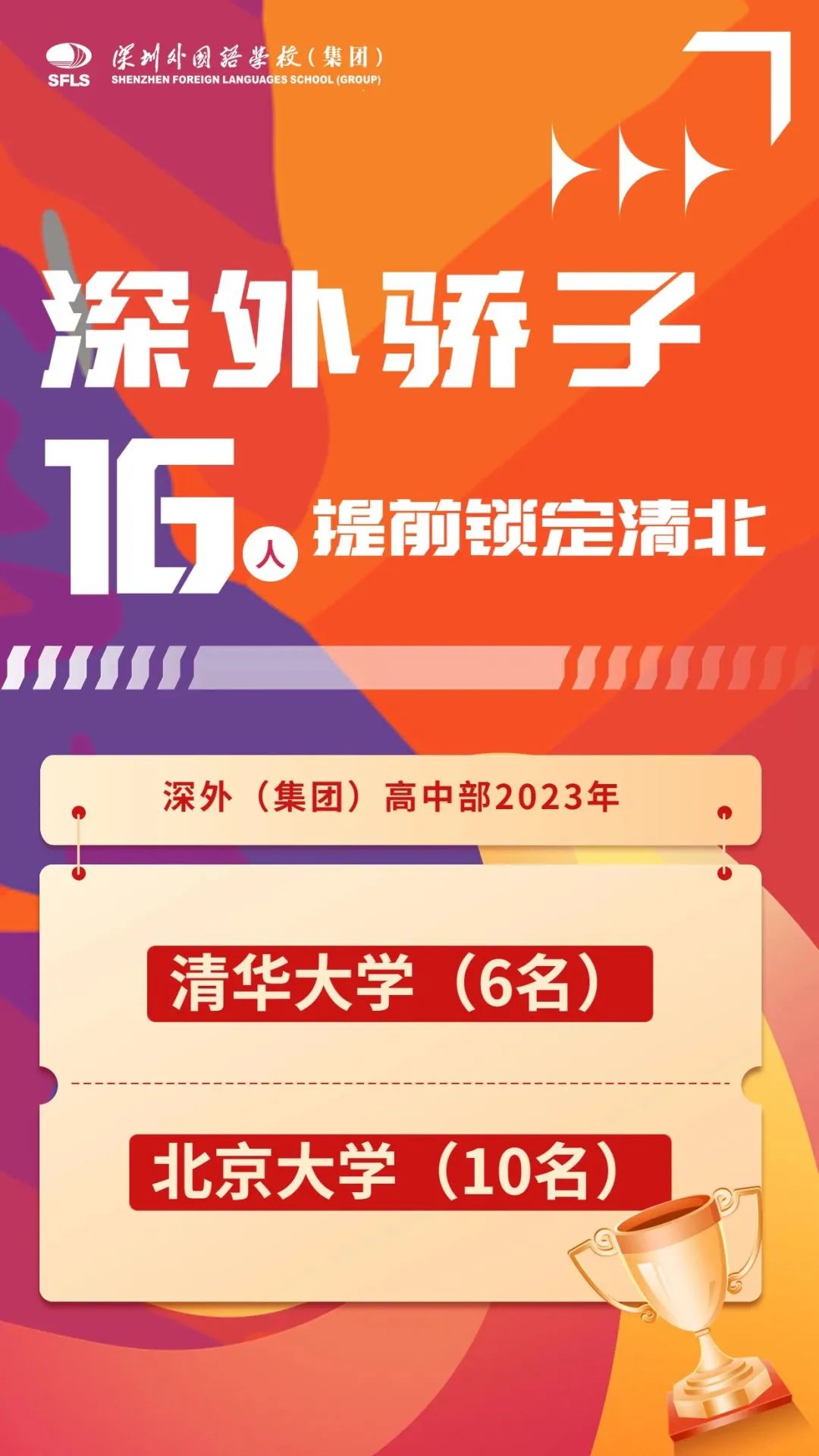 截至目前,深圳外国语学校(集团)高中部2023年已有16名同学提前锁定清华大学、北京大学。近期公布的2023年清华大学首届物理“攀登计划”,深外独占两席,入选人数全市最多。历年的保送人数稳居广东省第一名!