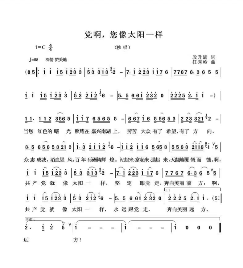 段升满作词的歌曲《党啊,您像太阳一样》,只有满怀对党的忠诚和感恩,经历过生死战场的考验,才能写出这激动人心的歌曲。段升满脱下军装,也没忘记自己是一名军人,按军人的标准严格要求自己。他的足迹遍布大街小巷,疫情期间,成为逆行者的一员,义务当起志愿者,哪里需要,他的身影就出现在哪里。发挥了一名党员、退伍军人的模范带头作用。获得了一枚奖章。2019年荣获“山东好人”、“济南好人”、“济南市优秀退役军人”等多项荣誉称号。