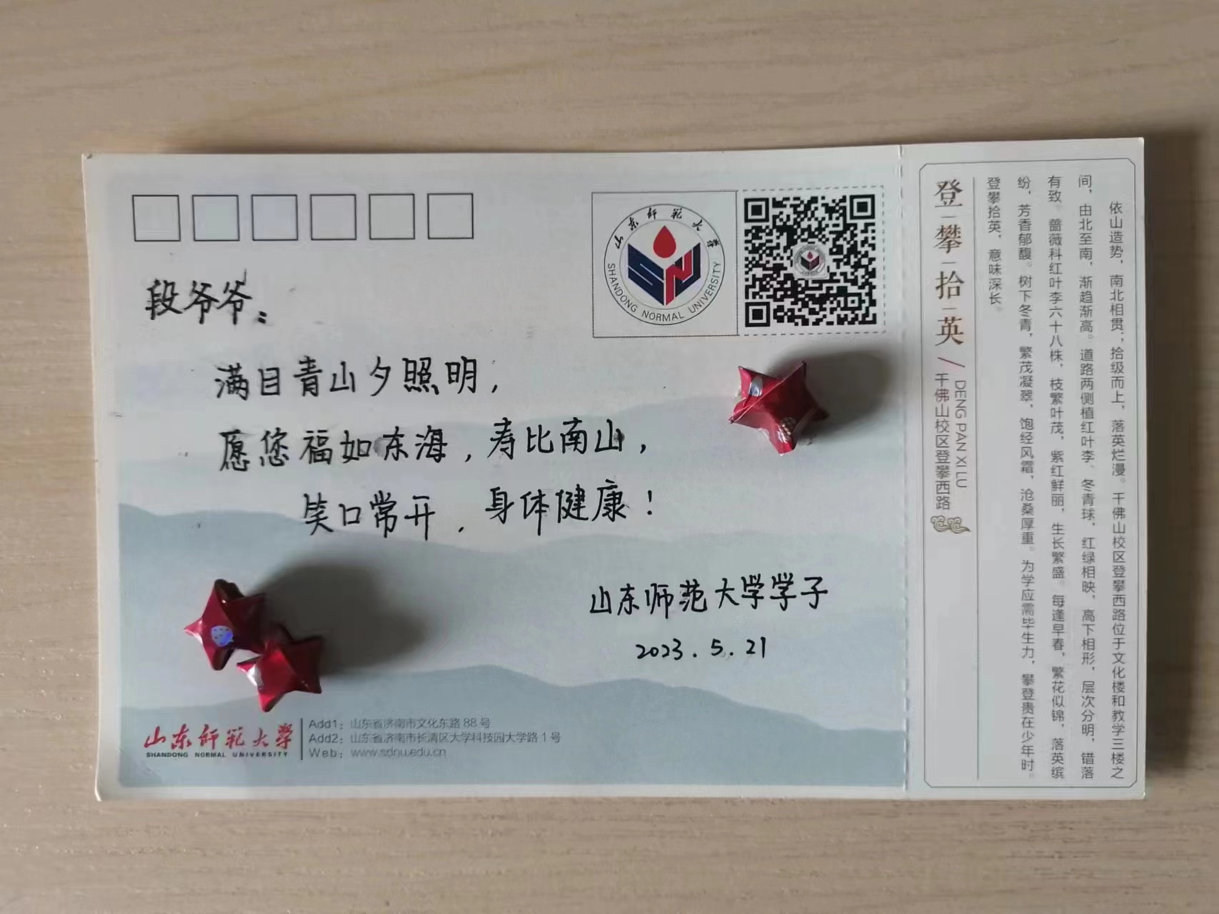最后和大学生们一起唱起了他作词的歌曲《党啊,您像太阳一样》,大学生们纷纷表示上了一堂生动的爱国主义教育课,备受鼓舞,一定要不忘历史,不忘先烈,好好学习,报效国家。大学生们为段升满送上了自己亲手做的卡片,表达了对英雄的敬佩之心和祝福。